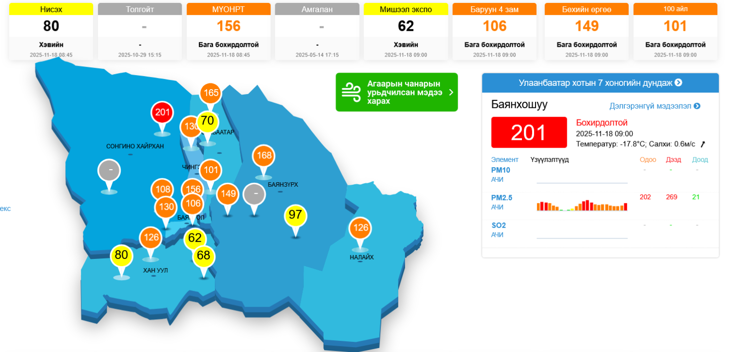 Улаанбаатар хотын агаарын бохирдлыг хэмждэг харуулуудын 09.00 цагийн мэдээгээр Баянхошуу орчимд агаарын бохирдол хамгийн их буюу 201 гэж зааж байна.