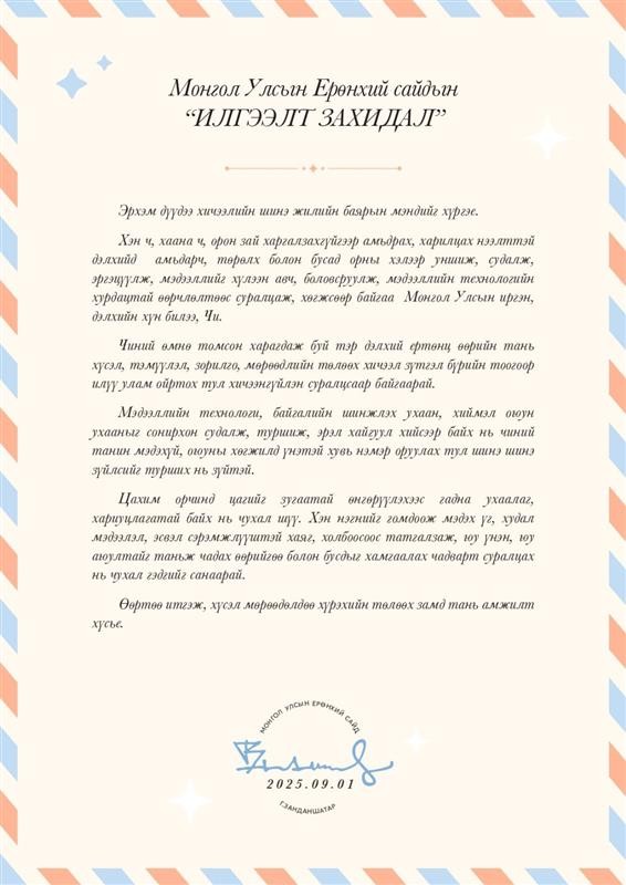 Монгол Улсын Ерөнхий сайд Г.Занданшатар хичээлийн шинэ жилийн баярын өдөр, Эх хэлний өдрийг тохиолдуулан оюутан, сурагчдад баяр хүргэж, захидал илгээжээ.