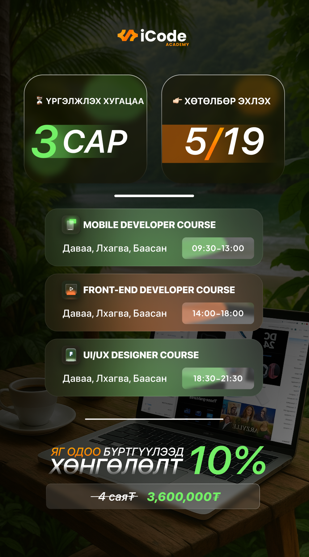“IT EXPERT summer” хөтөлбөр нь 5/19-д эхлэх тул та яг одоо бүртгүүлснээр 10-20% хямдралтай үнээр суралцах боломжтой.