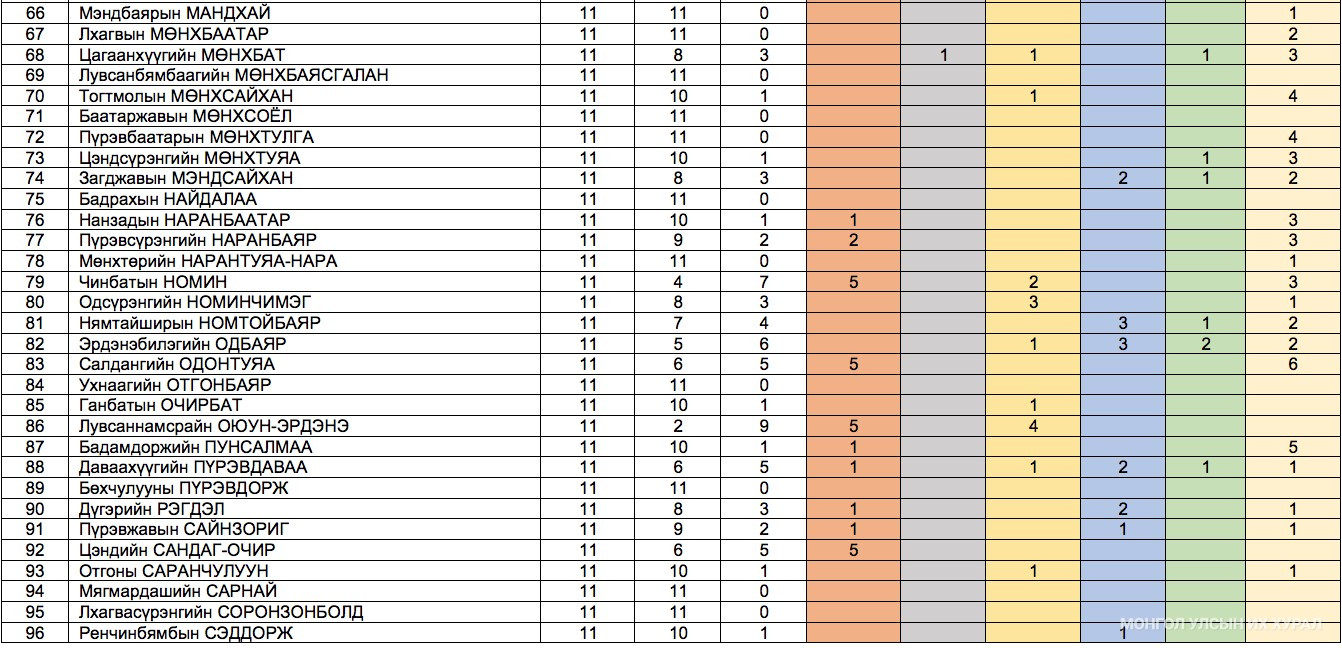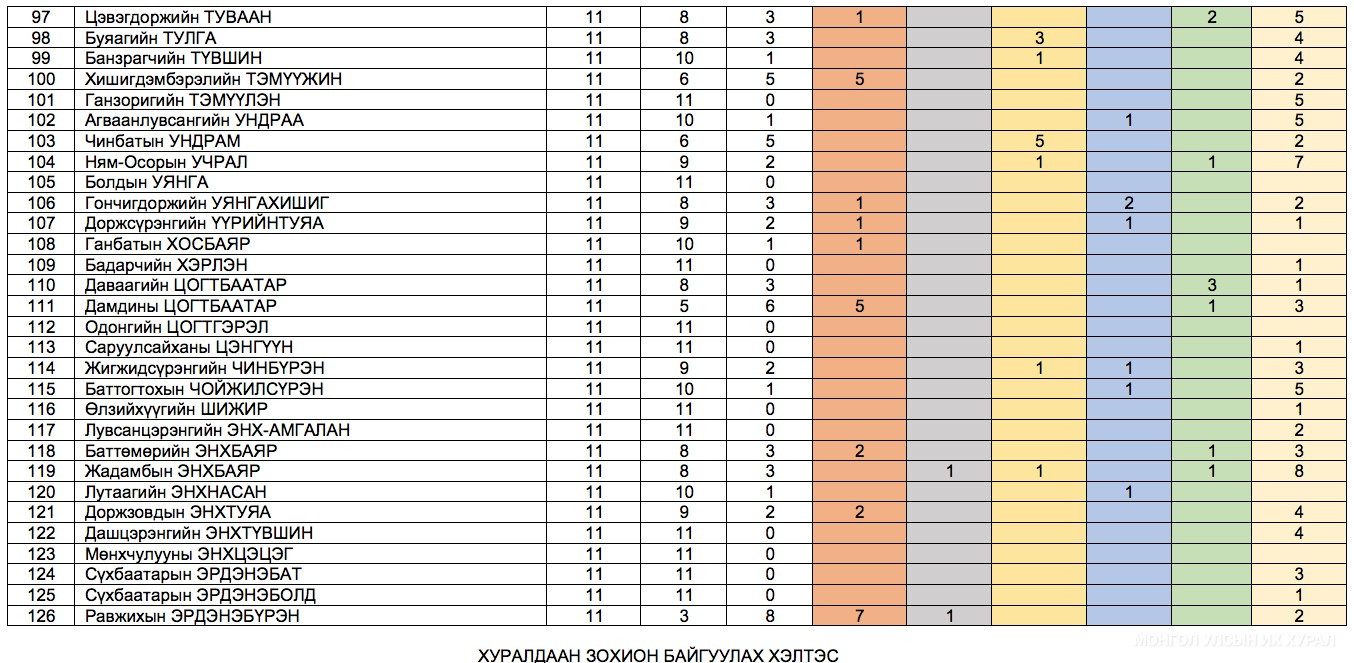 Чөлөөтэй ес, эмнэлгийн чөлөөтэй долоон гишүүн байна. Гадаад болон орон нутагт томилолттой яваа 14 гишүүн байна. ЭНД дарж гишүүдийн ирцийн мэдээллийг харна уу.