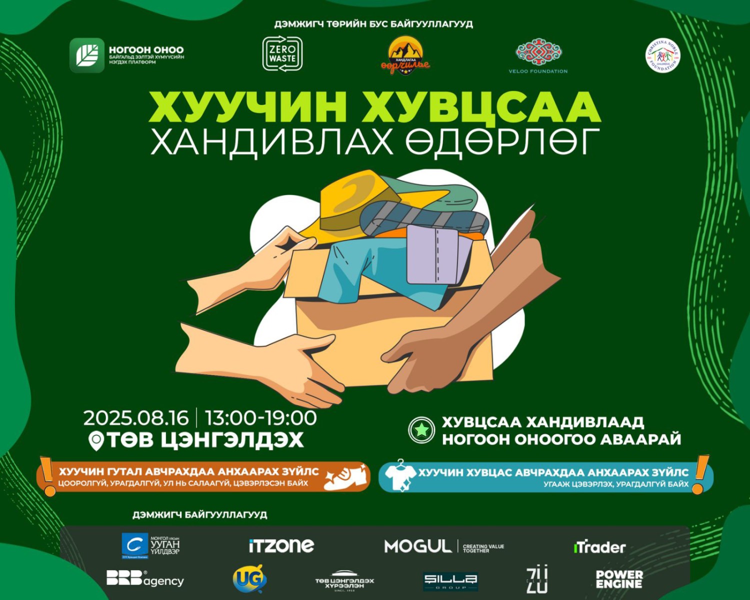 Тус арга хэмжээ нь хэрэглэхээ больсон эд зүйлсийг дахин ашиглах, хэрэгцээтэй хүмүүст хүргэх, нийгмийн сайн үйлсийг түгээх зорилготой бөгөөд Ногоон оноо байгаль ТББ, Zero Waste, Хандлагаа өөрчлье, Veloo Foundation, Christina Noble Foundation төрийн бус байгууллагууд өөрсдийн сувгаар түгээх үйл ажиллагааг дэмжин ажиллаж байна.