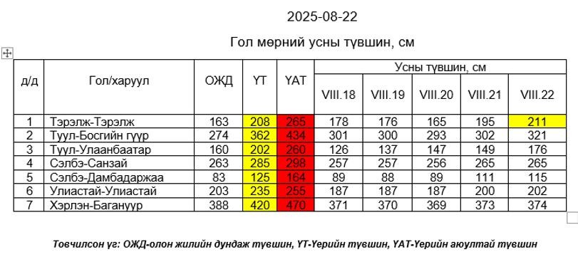 Өнөөдөр буюу наймдугаар сарын 22-ны өдрийн байдлаар Хэнтий нурууны баруун хажуугийн Туул, Тэрэлж, Сөгнөгөр зэрэг голын усны түвшин өмнөх өдрийнхөөс 10-30 см нэмэгдсэн.