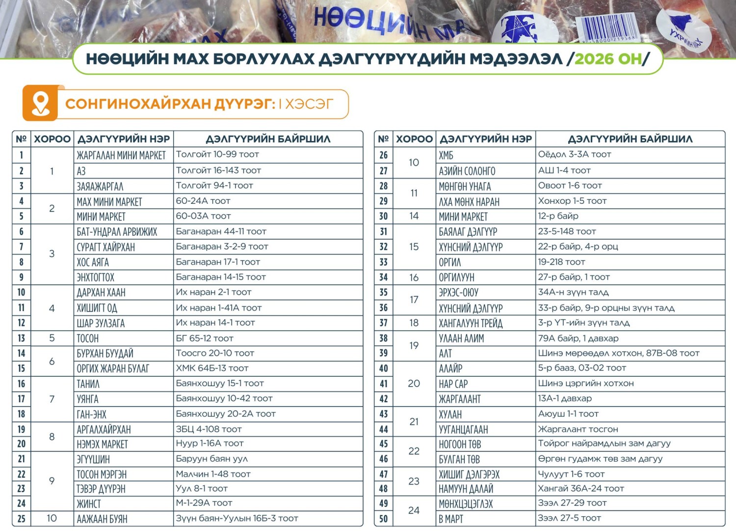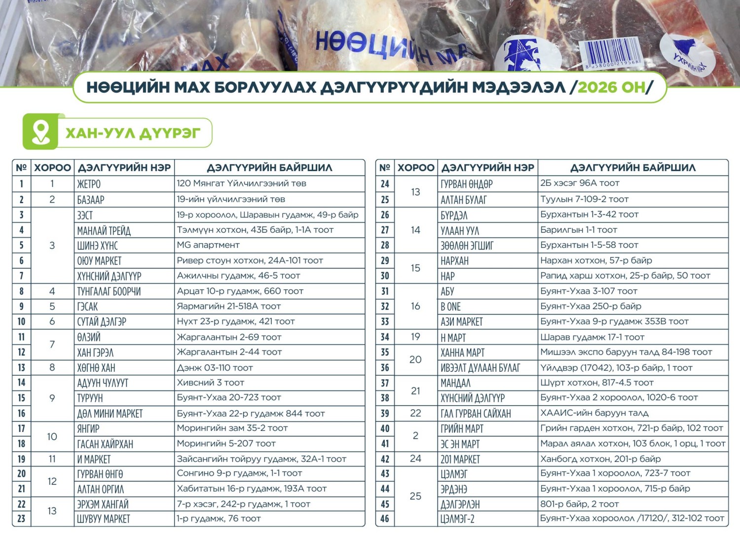 Нөөцийн мах худалдаалах байршлууд: