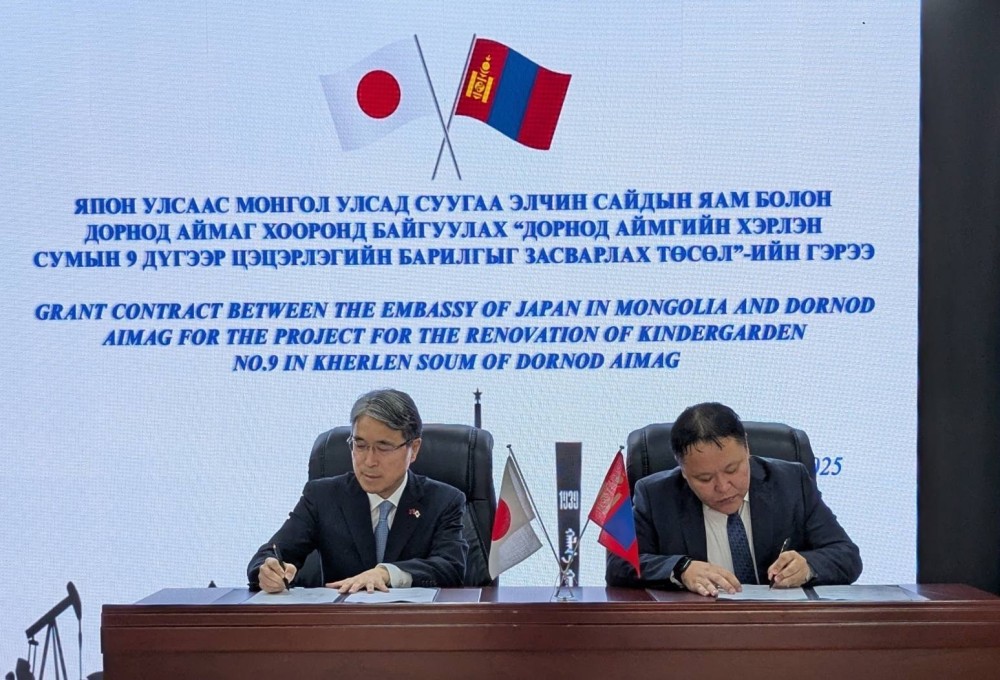 Япон Улсаас Монгол Улсад суугаа Онц бөгөөд Бүрэн эрхт Элчин сайд М.Игавахара болон Дорнод аймгийн Засаг дарга Ш.Ёл нар Япон Улсын Засгийн газрын 2025 оны “Өвсний үндэс - Хүний аюулгүй байдлыг хангах буцалтгүй тусламж”-ийн хөтөлбөрийн хүрээнд хэрэгжих “Дорнод аймгийн Хэрлэн сумын 9-р цэцэрлэгийн барилгыг засварлах төсөл”-ийн гэрээнд