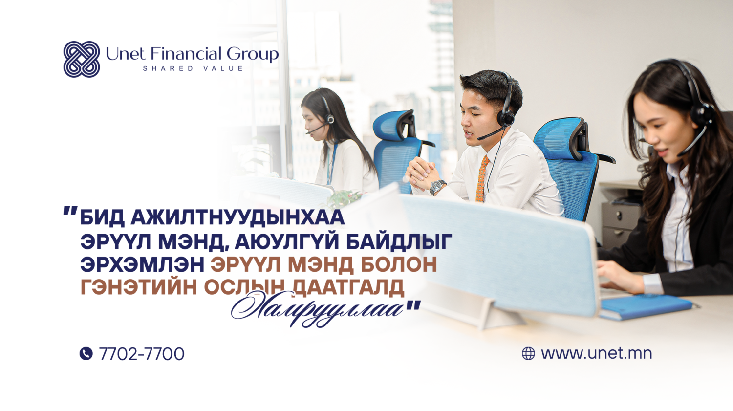 -Энэ асуултад хариулахаасаа өмнө Үнэт Санхүүгийн Нэгдэлийн ажилтнуудад юу хамгийн их чухал вэ гэдгийг дурдмаар байна. Манайх харьцангуй залуу компани боловч, санхүүгийн салбарын туршлагатай экспертүүд олон байгаа нь бидний хамгийн том давуу тал юм. Банкны салбарт 10-20 жил ажилласан туршлагатай залуус манай нийт ажилтнуудын 30%-г эзэлж байгаа нь залуу ажилтнуудад мэргэжлийн хувьд сурч хөгжих асар их боломжийг олгодог. Мэдээж манай компани ажилтнууддаа олон төрлийн хөнгөлөлт, хангамж үзүүлдэг ч энэхүү сурч хөгжих боломж бол хамгийн үнэ цэнтэй нь юм.