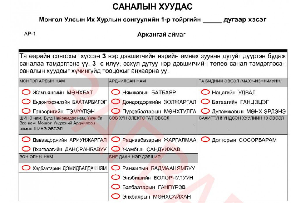 СЕХ-ноос УИХ-ын 2020 оны ээлжит сонгуулийн саналын хуудасны загварыг gec.gov.mn цахим хуудсанд байршуулжээ.