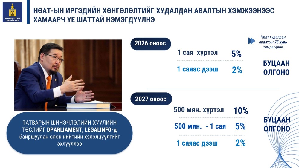 Одоо бид арван хувийн НӨАТ төлөөд хоёр хувийг нь улирал тутам буцаан авдаг. Тэгвэл ирэх оноос сард нэг сая төгрөг хүртэл үнийн дүнтэй худалдан авалт хийвэл 5 хувийн буцаалт авна. Нэг сая төгрөгөөс дээш худалдан авалтад 2 хувийн буцаалт өгнө.