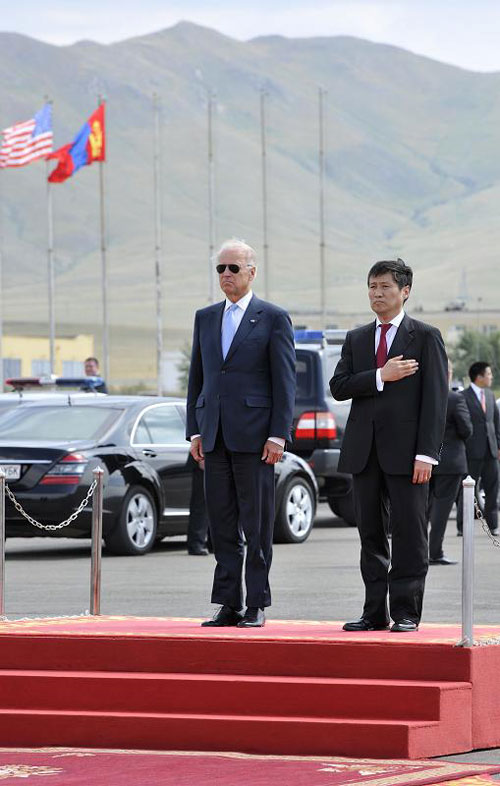 Монгол Улсын Ерөнхий сайд С.Батболд АНУ-ын дэд Ерөнхийлөгч эрхэмсэг ноён Жозеф Байденыг угтан авсны дараагаар Хүндэт харуулын дарга илтгэл өгч, хөгжимд хоёр орны “Төрийн дуулал” эгшиглэлээ. Угтах ёслолд Монгол Улсаас АНУ-д суугаа Онц бөгөөд Бүрэн Эрхт Элчин сайд Х.Бэхбат, Батлан хамгаалахын сайд Л.Болд, Гадаад харилцааны яамны Төрийн нарийн бичгийн дарга Д.Цогтбаатар нар байлцлаа.