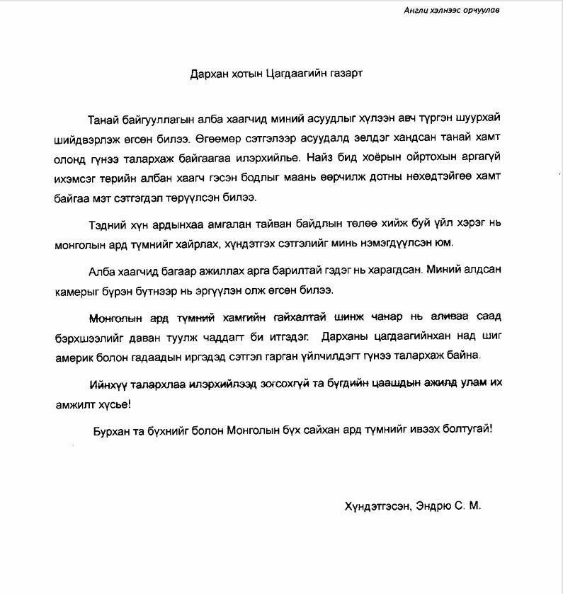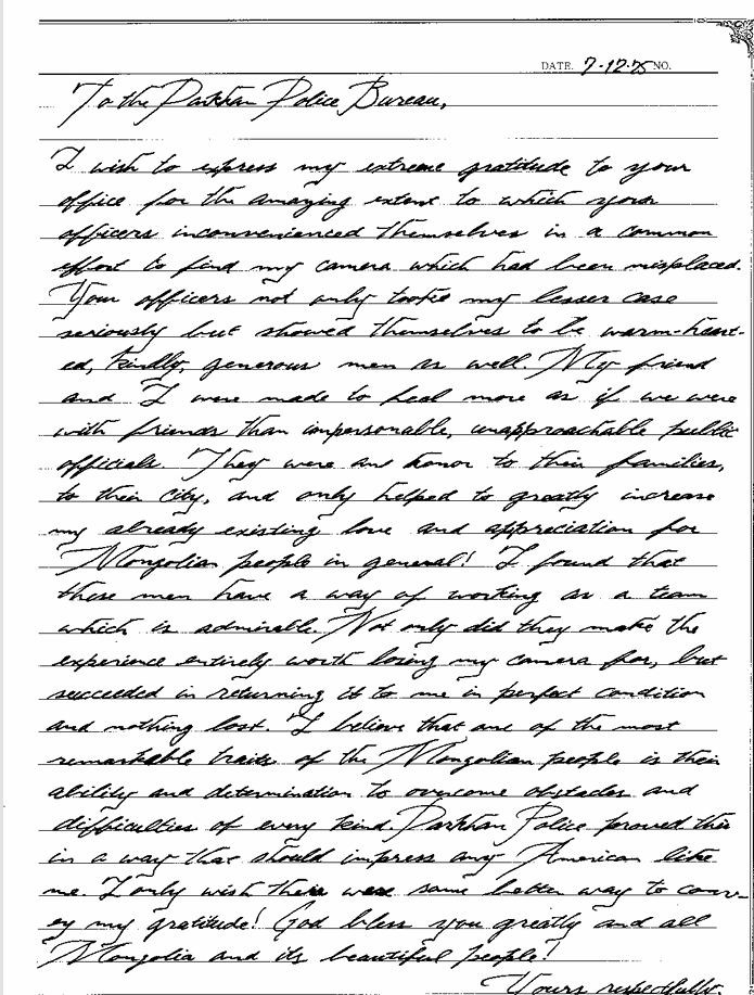 Уг үйл явдлын талаар Америкийн Нэгдсэн Улсын иргэн Эндрю тус аймгийн цагдаагийн газрын алба хаагчдын мэргэжлийн ур чадвар, сайхан сэтгэлийг цохон тэмдэглэж, цаашдын ажилд нь амжилт хүссэн талархал ирүүлсэн байна.