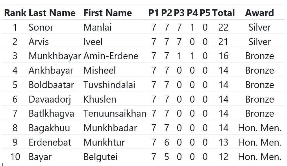 🎗11-р сургуулийн 12-р ангийн сурагч Б.Бэлгүтэй тусгай шагнал тус, тус хүртлээ гэж Монголын Математикийн Олимпиадын Хороо мэдээлэв.