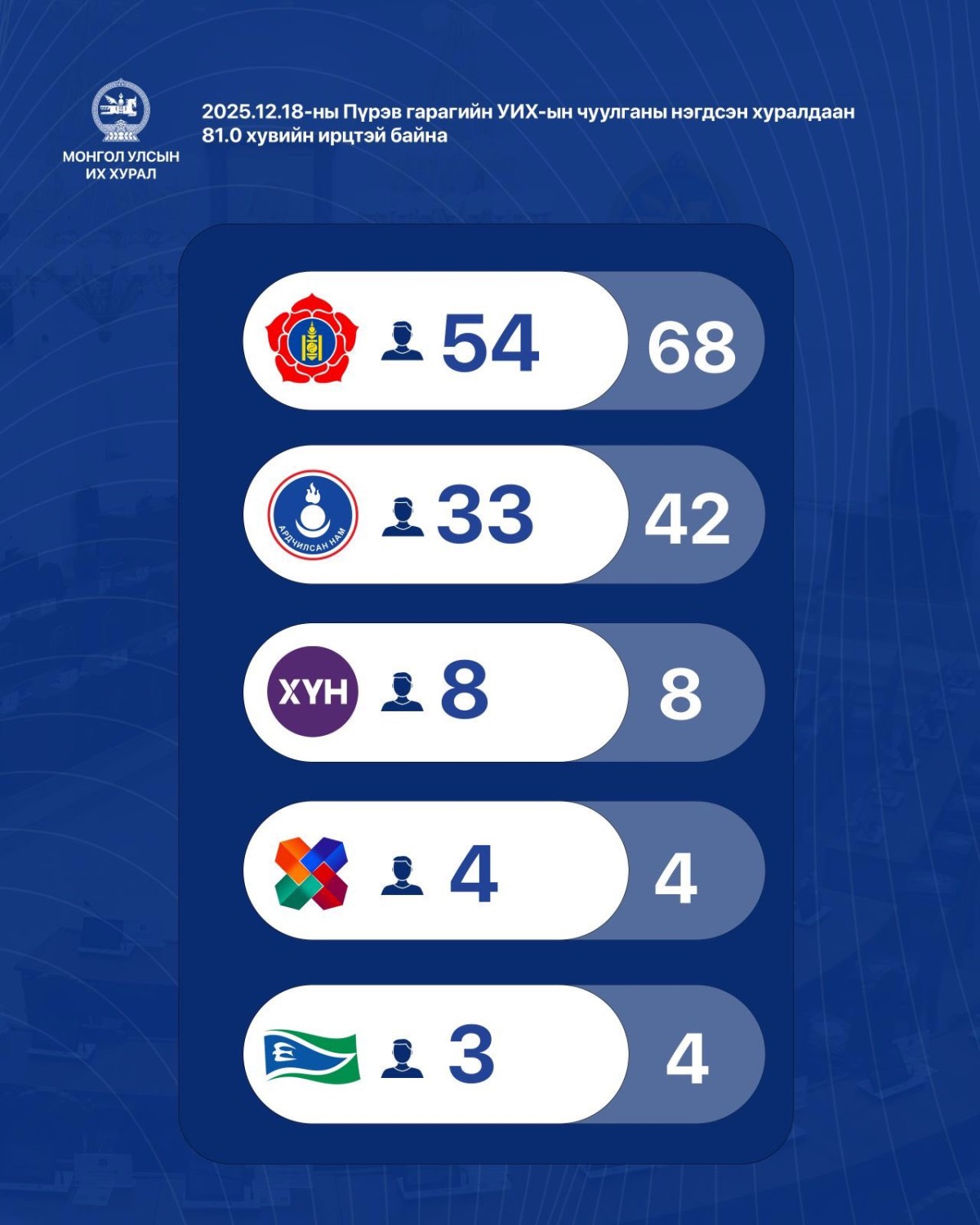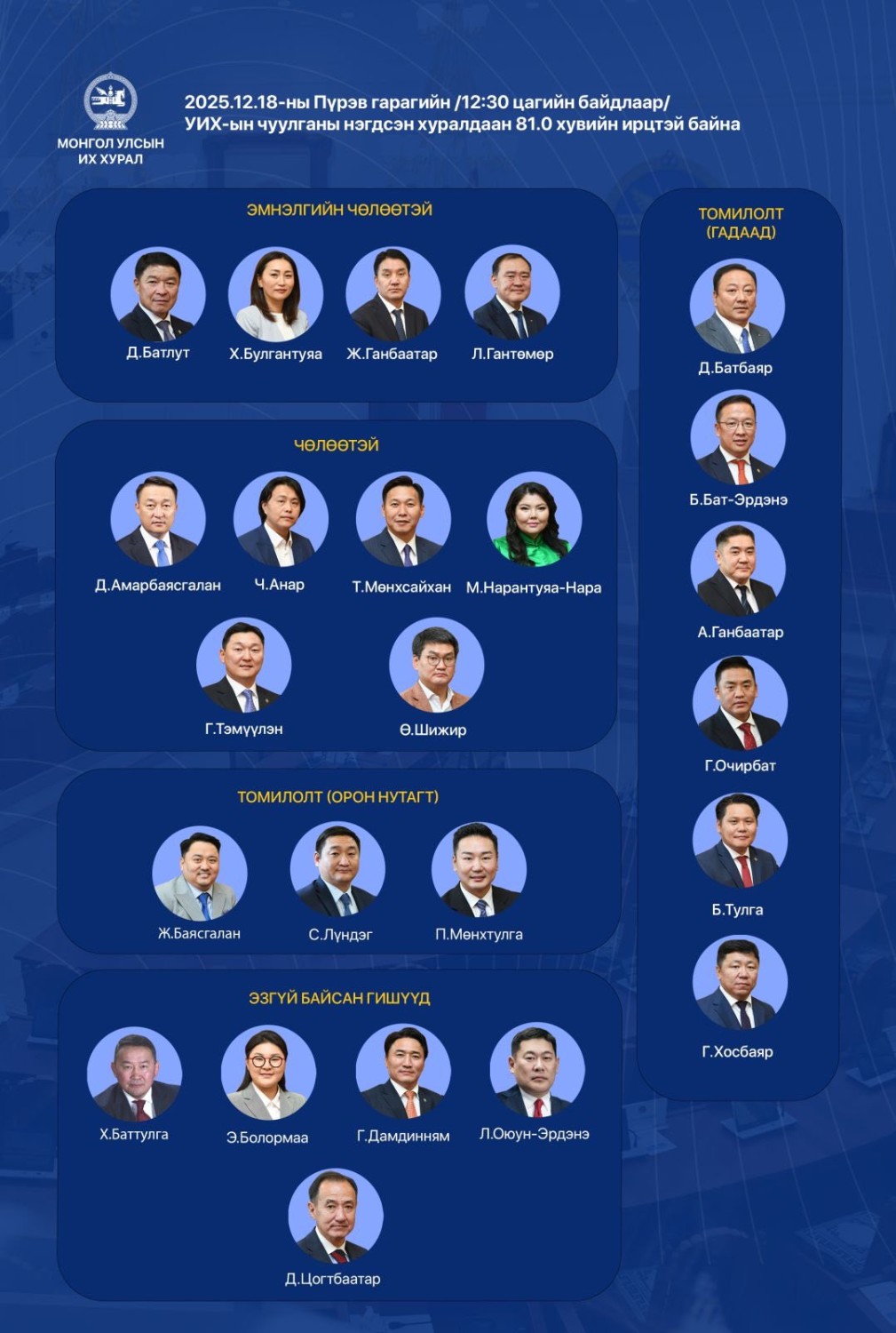 УИХ-ын чуулганы пүрэв гарагийн /2025.12.18/ нэгдсэн чуулганы ирцийг танилцуулж байна. Нэгдсэн хуралдааны ирц 12:30 цагийн байдлаар 81 хувьтай байв.