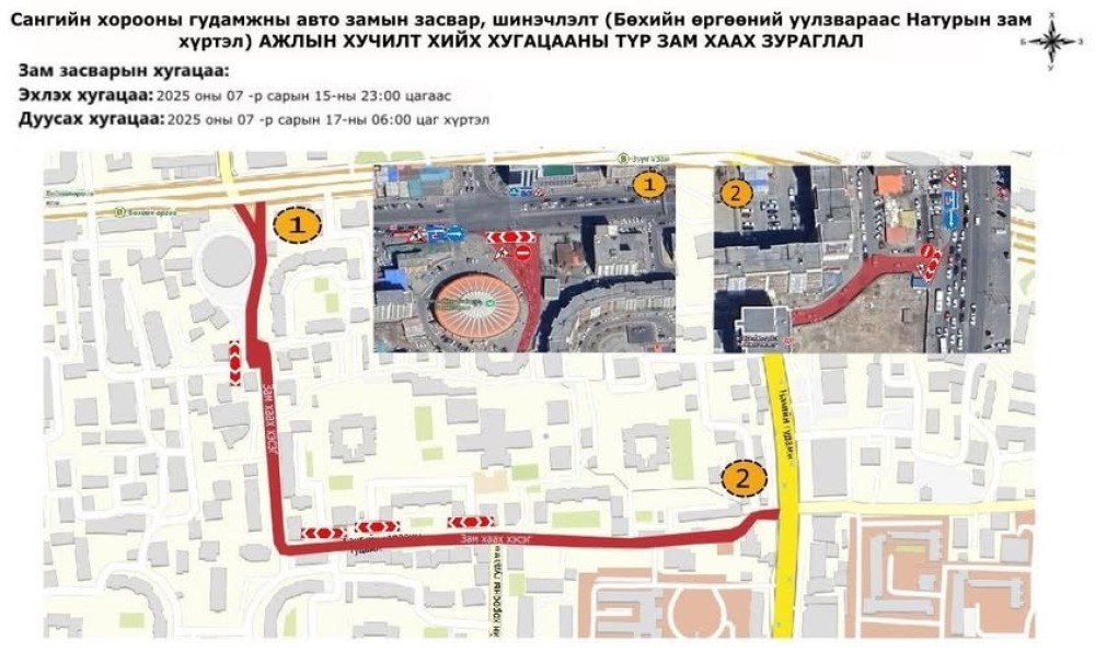 Сангийн хорооны гудамжны засвар, шинэчлэлтийн ажлын хүрээнд Бөхийн өргөөний уулзвараас Натурын зам хүртэлх авто замыг хааж, шинэчилнэ.