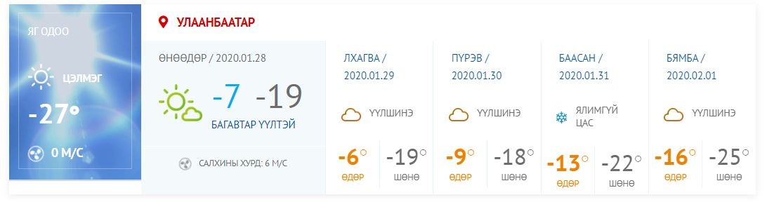 УЛААНБААТАР ХОТ: Багавтар үүлтэй. Цас орохгүй. Салхи баруун өмнөөс секундэд 4-9 метр. Шөнөдөө Яармаг-Сонгины орчмоор 28-30 градус, бусад хэсгээр 18-20 градус, өдөртөө 6-8 градус хүйтэн байна.