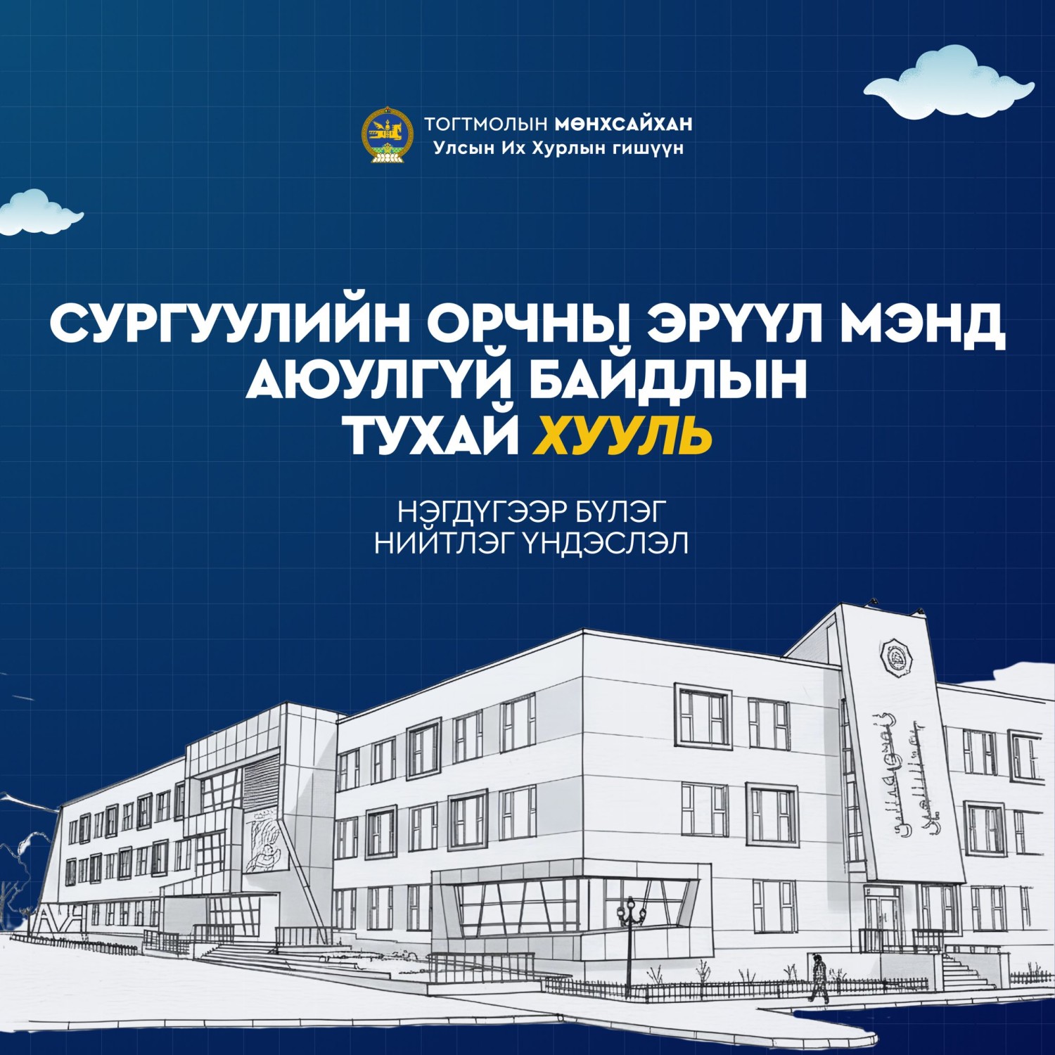 Сургуулийн орчинд хүүхэд бүр эрүүл, аюулгүй, хамгаалагдсан орчинд сурч хөгжих эрхийг хангах зорилгоор “Сургуулийн орчны эрүүл мэнд, аюулгүй байдлын тухай” анхдагч хуулийн төслийг УИХ-д өргөн барьжээ.