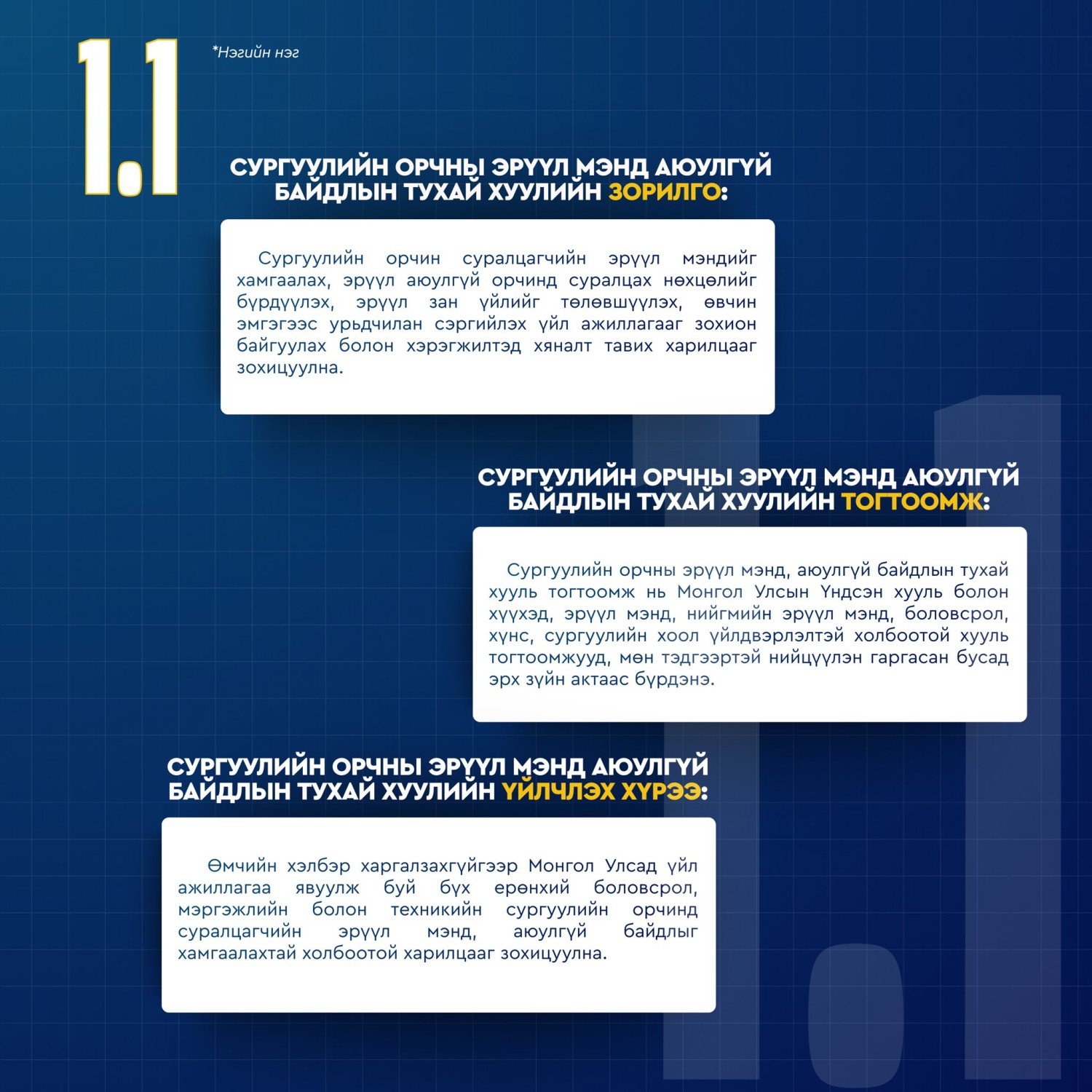 - сургуулийн орчны аюулгүй байдлыг стандартын түвшинд хангах эрх зүйн үндсийг бий болгоход чиглэсэн.