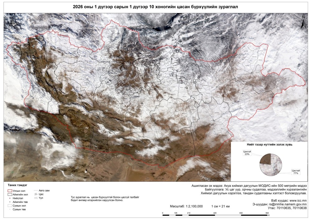 2026 оны 1 дүгээр сарын 10-ны өдрийн байдлаар Монгол орны нийт нутгийн 77 хувьд цасан бүрхүүлтэй байна. Цасан бүрхүүлийн хэмжээ өмнөх 10 хоногоос гурван хувиар нэмэгджээ.