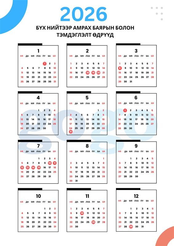 Тэгвэл 2026 онд бүх нийтийн амралтын өдрүүд хэрхэн тохиож буйг та бүхэнд танилцуулж байна.