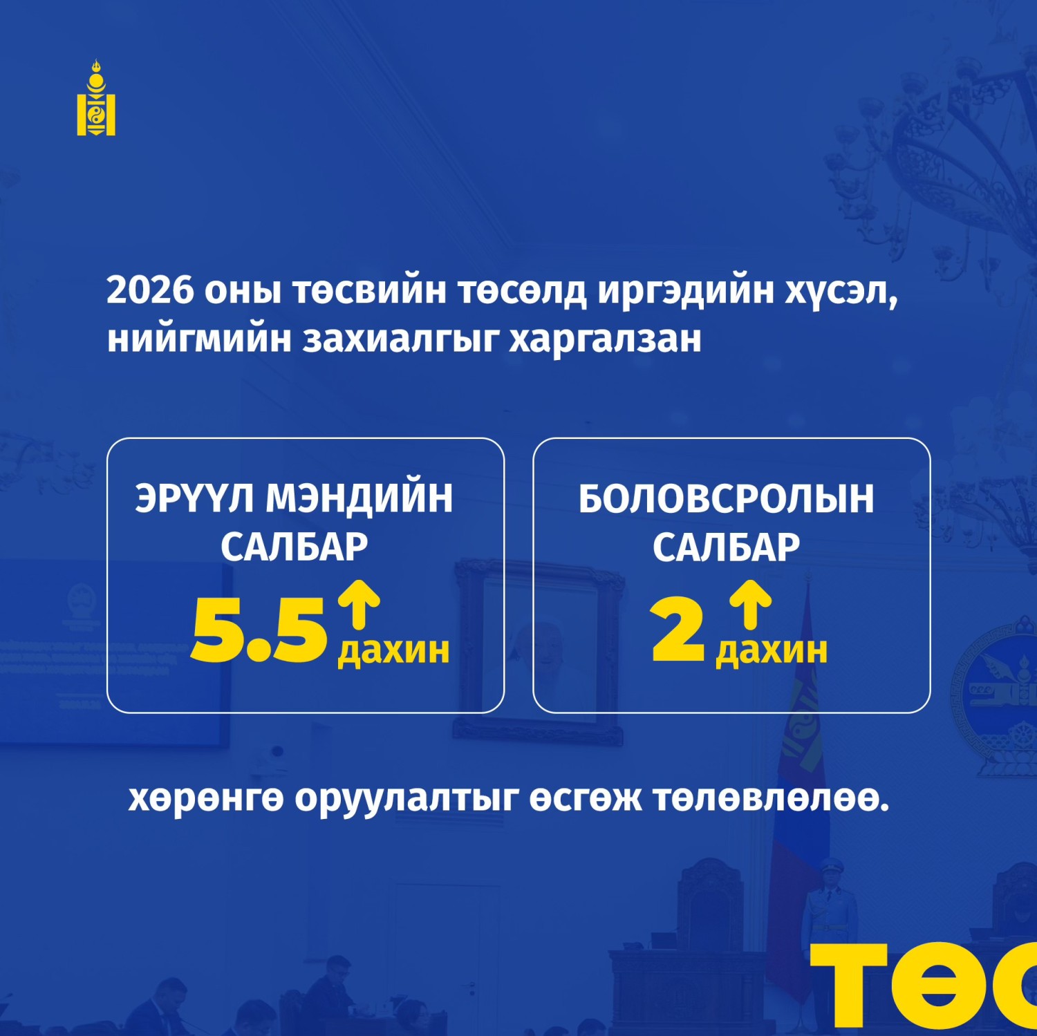 Иргэдийн хүсэл, нийгмийн захиалгад нийцүүлж, эрүүл мэндийн салбарын хөрөнгө оруулалтыг 5.5 дахин, боловсролын салбарын хөрөнгө оруулалтыг 2 дахин нэмэхээр төлөвлөв. Зээл, тусламжийг энэ чиглэлд түлхүү чиглүүлэхээр тооцов хэмээн Засгийн газраас мэдээллээ.