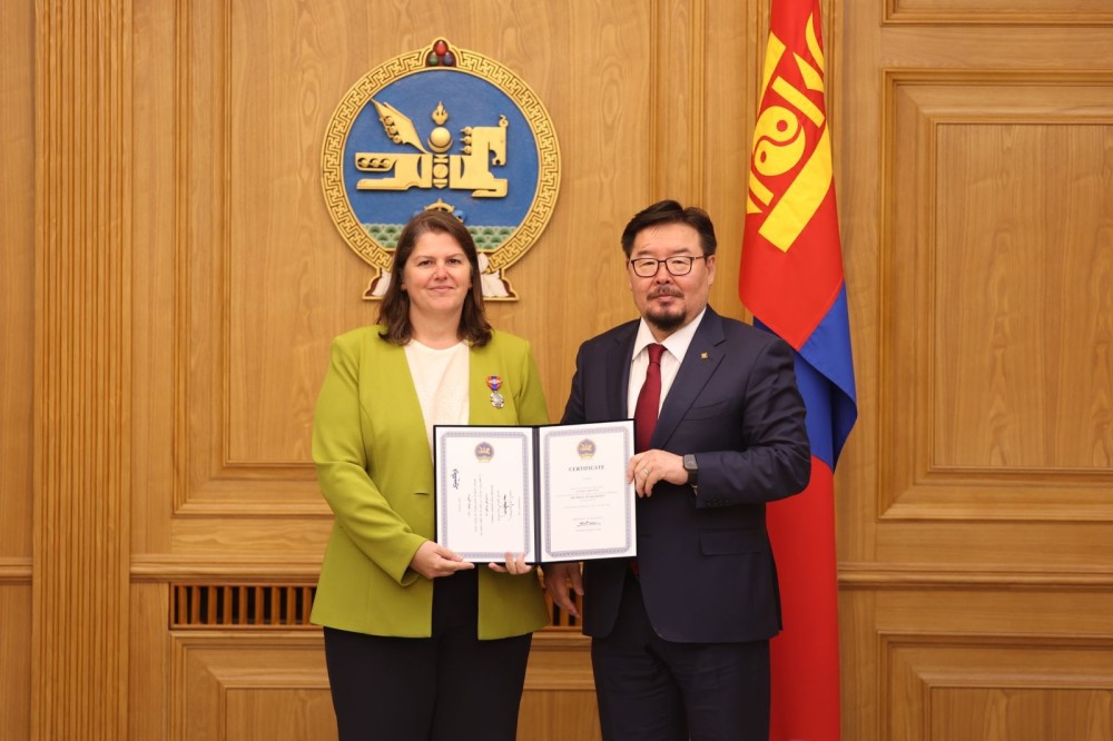 Хоёр улсын харилцаа, хамтын ажиллагааг Иж бүрэн түншлэлийн түвшинд хүргэх, өргөжүүлэн бэхжүүлэхэд оруулсан хувь нэмрийг нь үнэлж Монгол Улсын Ерөнхийлөгч У.Хүрэлсүхийн зарлигаар Канад Улсаас Монгол Улсад суугаа Элчин сайд Сандра Шүфани-г “Найрамдал” медалиар шагнасныг гардууллаа.