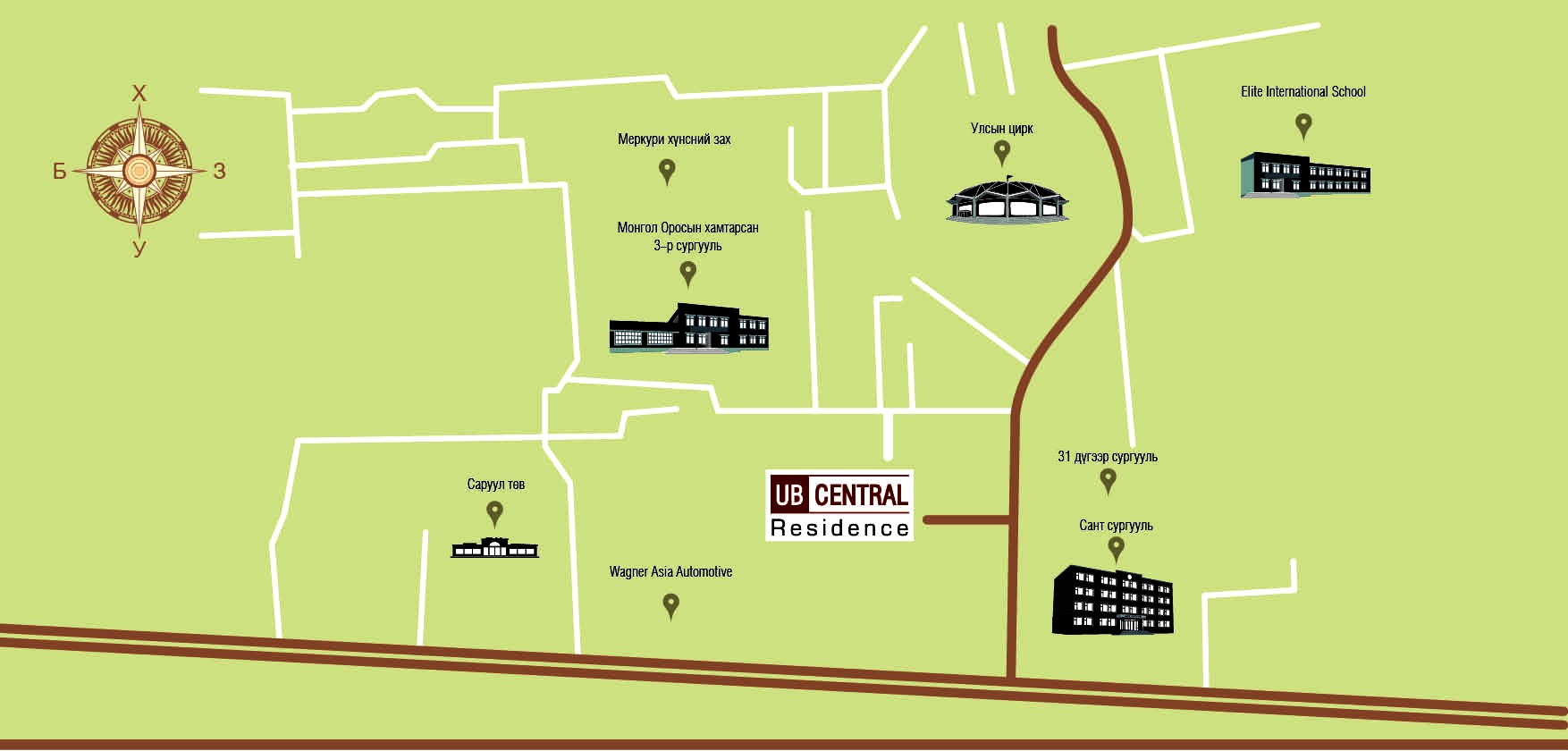 Манай төслийн хаяг: Сүхбаатар дүүргийн 3-р хороо, Урбаник төвийн баруун хойно, Сант сургуулийн замын баруун талд Ub Central Residence