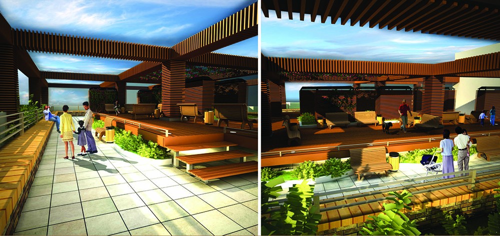 Орон сууцны дээврийг бичил цэцэрлэг, амарч салхилах саравч зэргээр тохижуулж, оршин суугчдынхаа тав тух, хэрэгцээнд нийцүүлэн цахилгаан шатыг дээврийн цэцэрлэгт зогсоохоор төлөвлөж өгсөн.