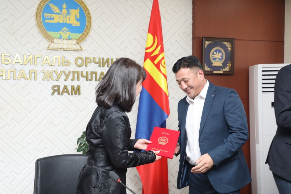 2016 оноос хойш төрийн албанд зүтгэл гарган ажиллаж буй Байгаль орчин, аялал жуулчлалын яамны жолооч Шарав-Арилдын Цолмонд Байгаль орчин, аялал жуулчлалын яамны жуух бичгийг гардуулав.