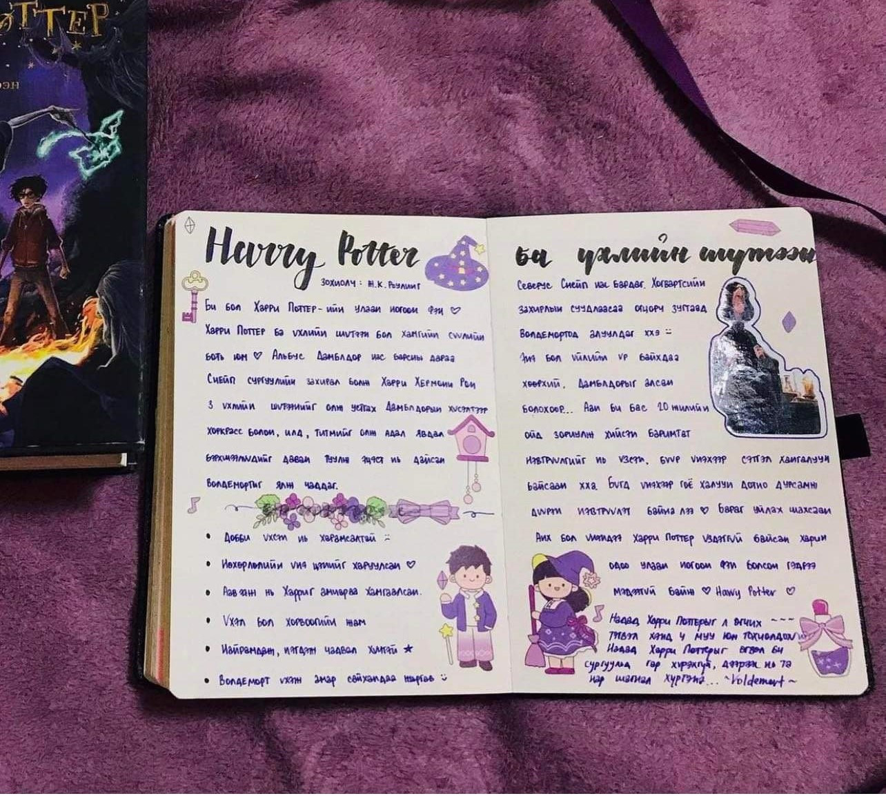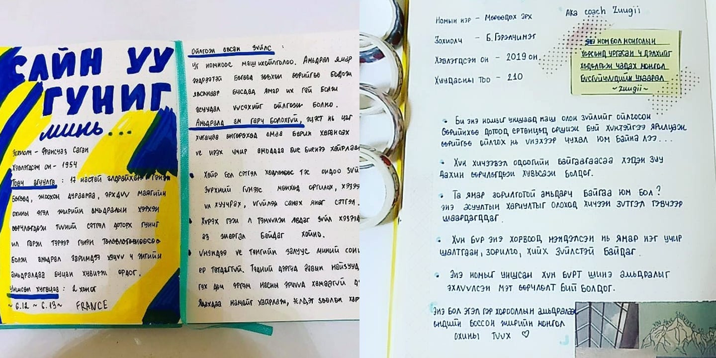 Уншсан номоосоо ойлгосон зүйл, таалагдсан дүр, эшлэл гэх мэт зүйлсээ номын тэмдэглэлдээ буулгадаг.