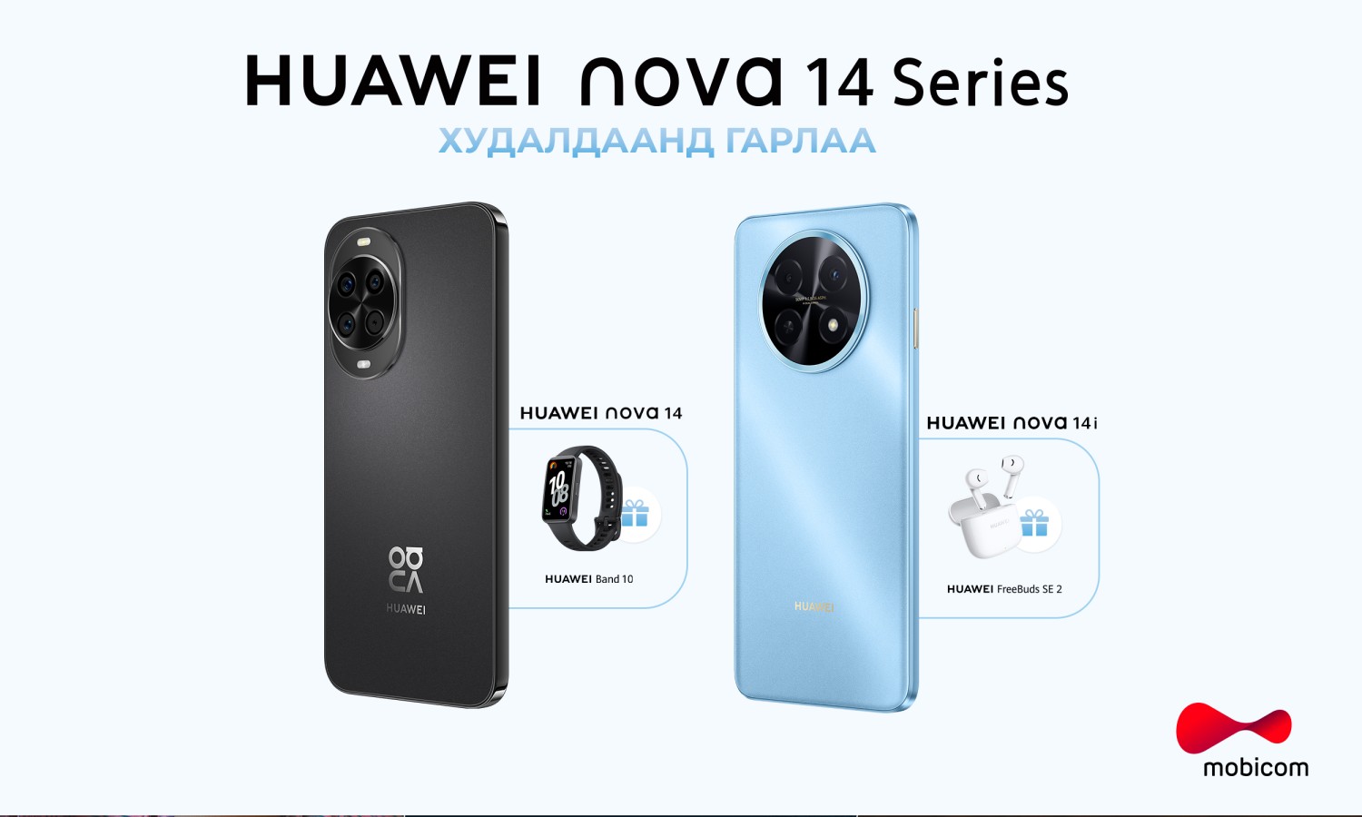 HUAWEI Nova 14 серийн ухаалаг гар утсыг мобикомын онлайн дэлгүүр болон салбаруудаас бэлнээр болон ХУВААЖ ТӨЛӨХ НӨХЦӨЛӨӨР худалдан аваад HUAWEI Band 10 болон HUAWEI Freebuds SE2 бэлгэнд аваарай.