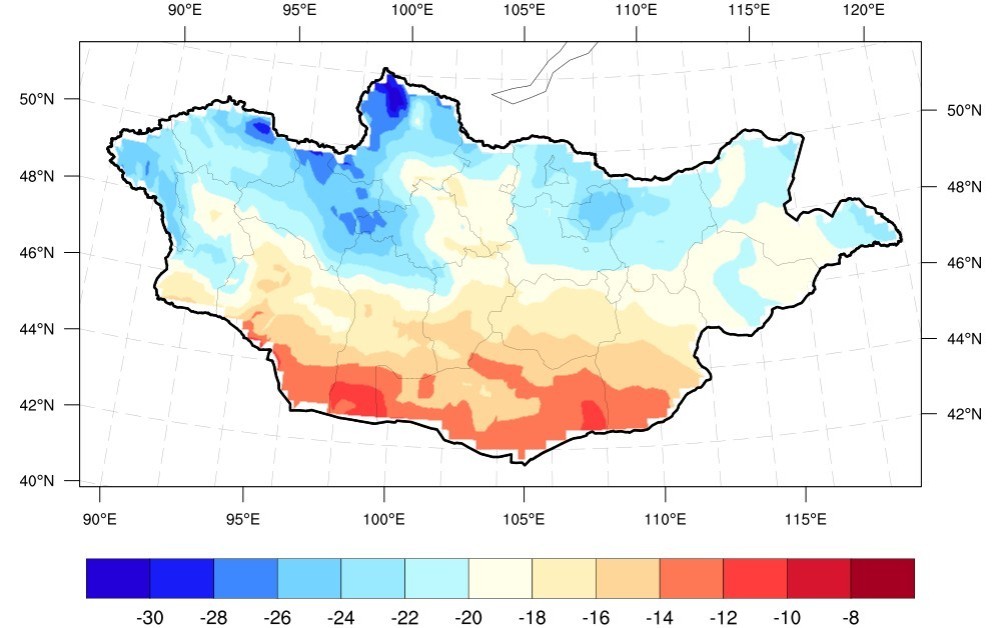 Арванхоёрдугаар сарын агаарын температурын ОЖД нь Баян–Өлгийн ихэнх, Увс, Завханы зүүн, Баянхонгорын хойд, Хөвсгөл, Архангайн баруун, Төв аймгийн зүүн хойд хэсгээр -24...-30°C, Говь–Алтай, Баянхонгор, Өвөрхангай, Дундговь, Дорноговийн өмнөд хэсэг болон Өмнөговийн нутгаар -10...-16°C, бусад нутгаар -16...-24°C хүйтэн байдаг (Зурaг 1).
