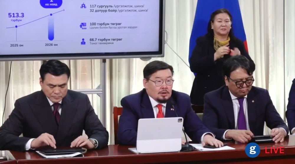 Ерөнхий сайд Г.Занданшатар Монгол Улсын 2026 оны нэгдсэн төсвийн төслийг танилцуулж байна. Монгол Улсын 2026 оны нэгдсэн төсвийн тэнцвэржүүлсэн орлогыг 31.6 их наяд төгрөг, нэгдсэн төсвийн нийт зарлага 32 их наяд 980 тэрбум төгрөг, төсвийн тэнцэл ДНБ-ий 1.3 хувийн алдагдалтай байхаар төлөвлөсөн юм.