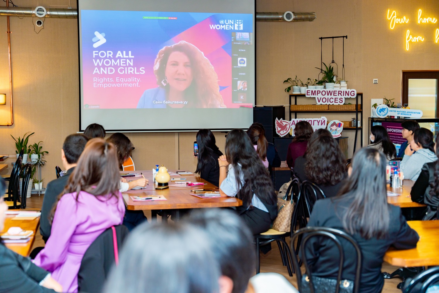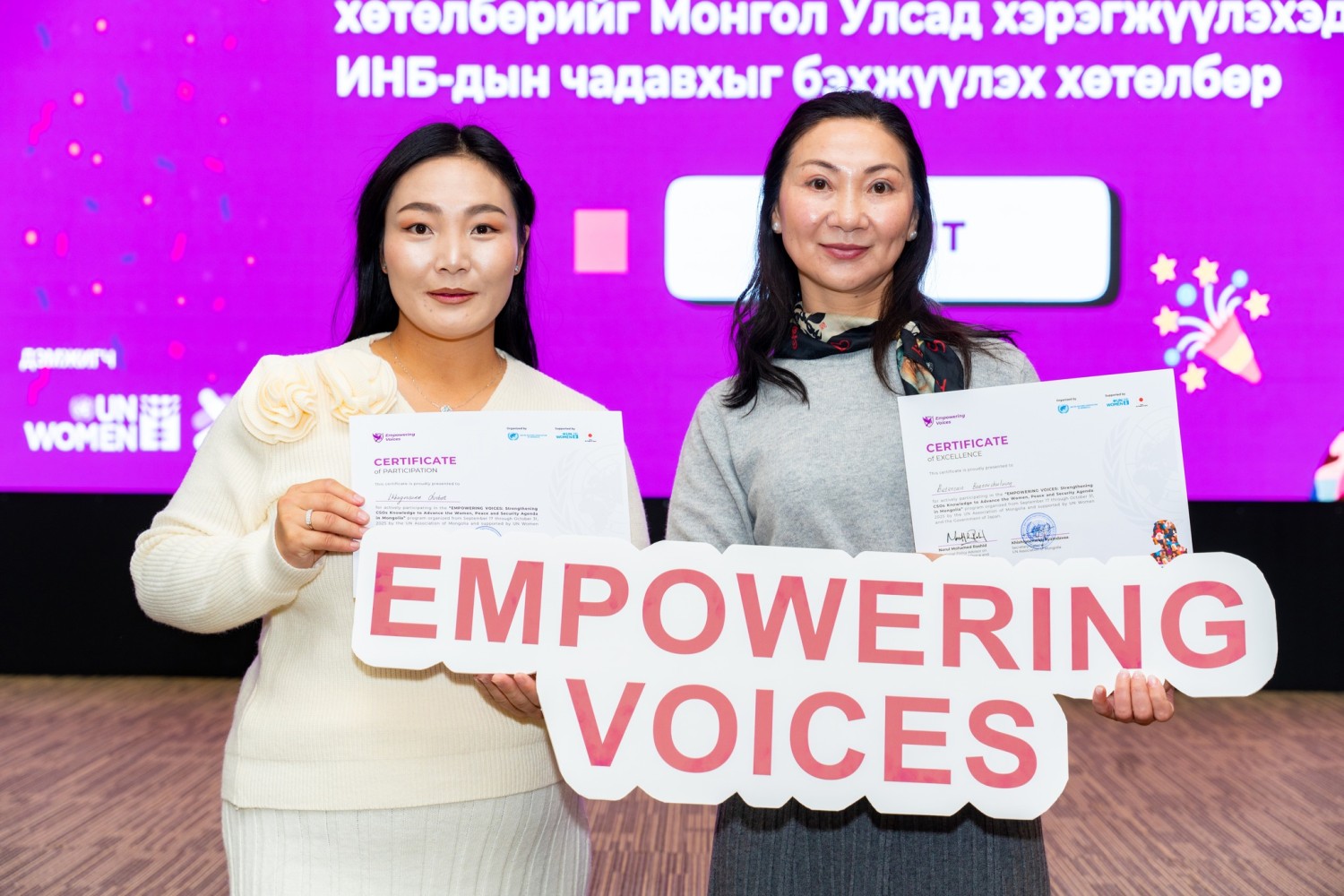 Монгол Улс дахь НҮБ-ын Нийгэмлэг нь НҮБ-ын Эмэгтэйчүүдийн байгууллага, Япон Улсын засгийн газрын дэмжлэгтэйгээр “Empowering Voices” буюу "Эмэгтэйчүүд, энх тайван, аюулгүй байдлын хөтөлбөрийг Монгол Улсад хэрэгжүүлэхэд Иргэний Нийгмийн Байгууллагуудын чадавхыг бэхжүүлэх" төслийг хэрэгжүүллээ.