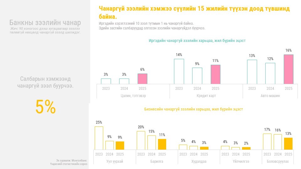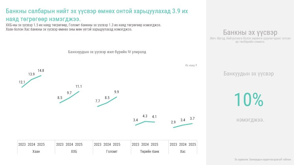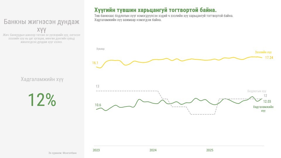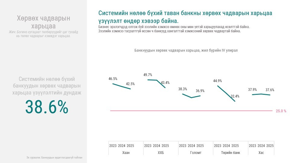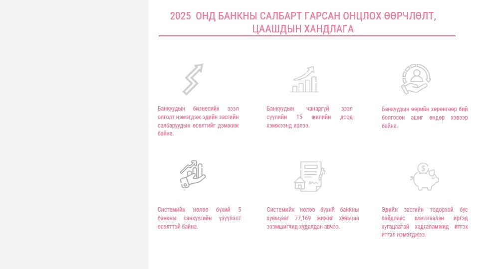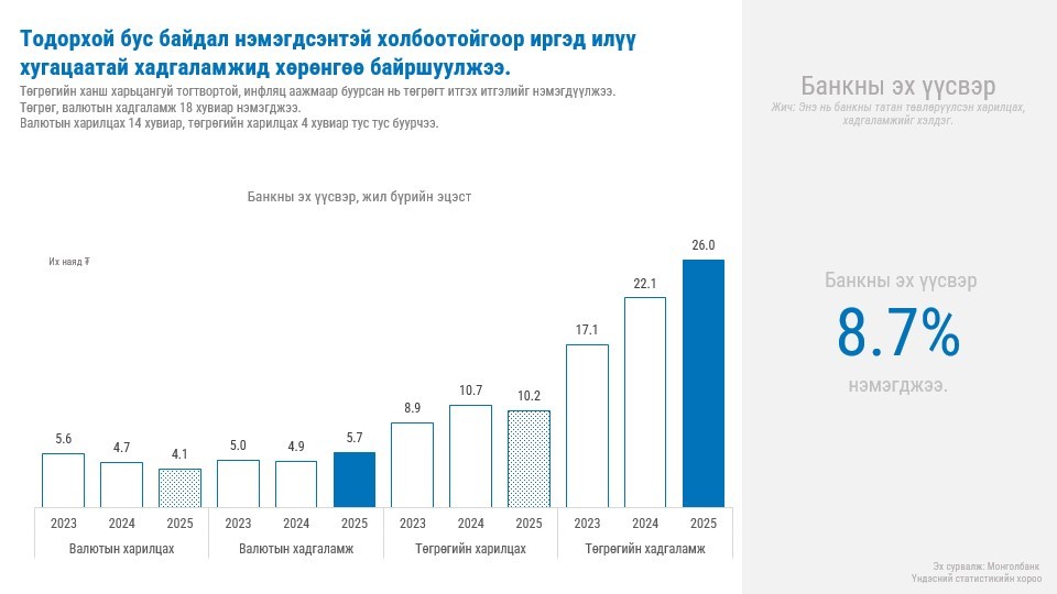 “Банкны салбарын 2025 оны тойм” судалгааг танилцууллаа. Тус хуралд Монголын Банкны Холбооны Ерөнхийлөгч О.Хүрэлбаатар болон Гүйцэтгэх захирал Л.Амар, Банк Санхүүгийн Академийн Ахлах эдийн засагч Ч.Сосорбарам нар банкны салбарын 2025 оны жилийн эцсийн үзүүлэлтүүд, макро эдийн засгийн нөхцөл байдал болон цаг үеийн сэдвүүдээр мэдээлэл өглөө.