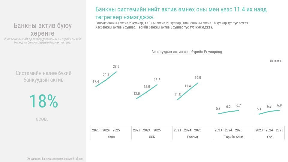 Банкны салбарын үзүүлэлт тогтвортой, өсөлттэй байлаа. Банкны салбарын нийт актив өмнөх оны мөн үетэй харьцуулахад 20 хувиар нэмэгджээ. Чанаргүй зээлийн хэмжээ сүүлийн 15 жилийн доод хэмжээнд хүрлээ. Банкнуудын өөрийн хөрөнгийн өгөөж хадгаламжийн өгөөжөөс өндөр байна. Эдийн засгийн салбаруудыг дэмжихэд чиглэсэн банкны зээлийн өсөлт үргэлжилсээр байна.
