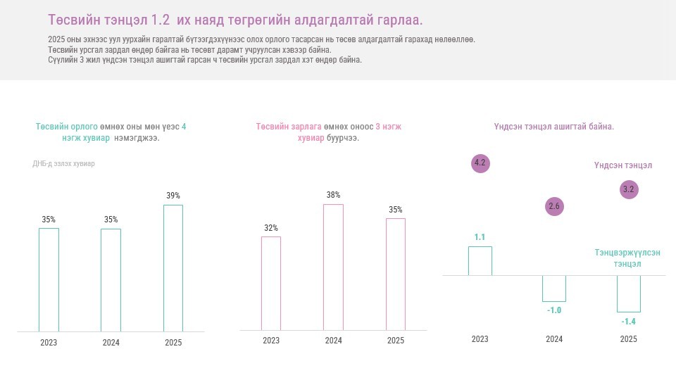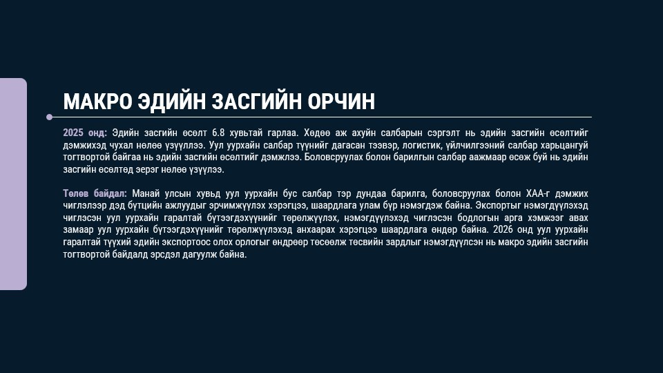 Уул уурхайн гаралтай эрдэс бүтээгдэхүүн тэр дундаа нүүрсний үнийн болон тоон хэмжээний өсөлтөд найдан эдийн засгийн өсөлтийг өндөр байхаар төлөвлөж, төсвийн зарлагыг нэмэгдүүлэх нь ганц мод гал болдоггүйтэй адил хэтэрхий өрөөсгөл байна. Иймд уул уурхайн эрдэс бүтээгдэхүүний төрөлжилтөөс эхлээд бусад салбаруудын өрсөлдөх чадварыг нэмэгдүүлж, эдийн засгийн тогтвортой өсөлтийг анхаарахад ихээхэн анхаарал хандуулах шаардлагатай болох нь харагдаж байна.