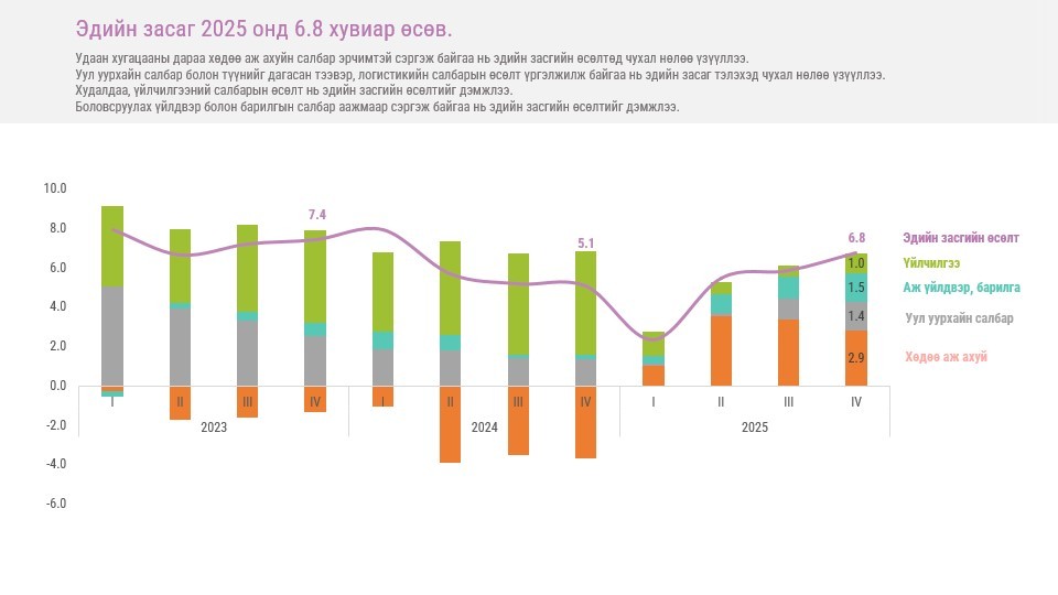 Цаг уурын нөхцөл байдлаас шалтгаалж хүндрээд байсан хөдөө аж ахуйн салбар сэргэсэн нь эдийн засгийн өсөлтөд чухал нөлөө үзүүллээ. Уул уурхайн салбар болон түүнийг дагасан тээвэр, логистикийн салбарын өсөлт тогтвортой, үйлчилгээ болон худалдааны салбарын өсөлт үргэлжилсэн нь эдийн засаг 6.8 хувиар өсөхөд чухал нөлөө үзүүлсэн.