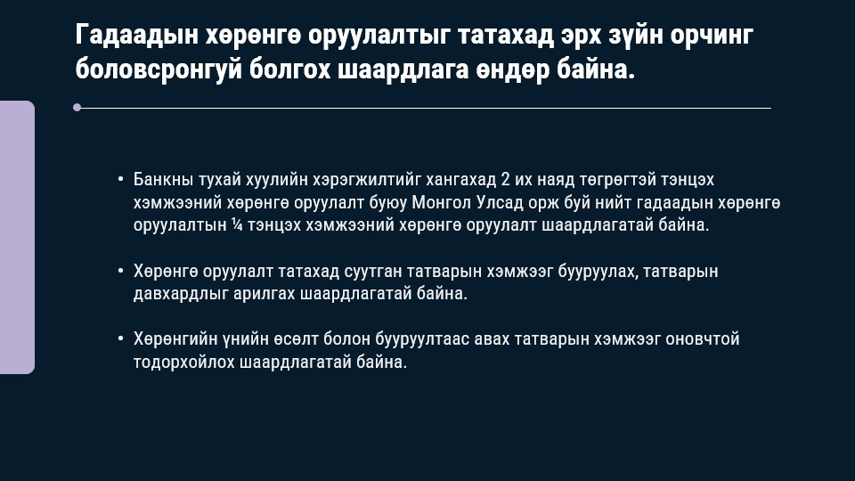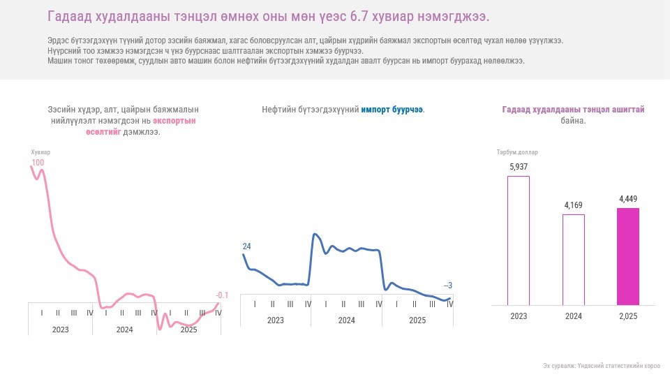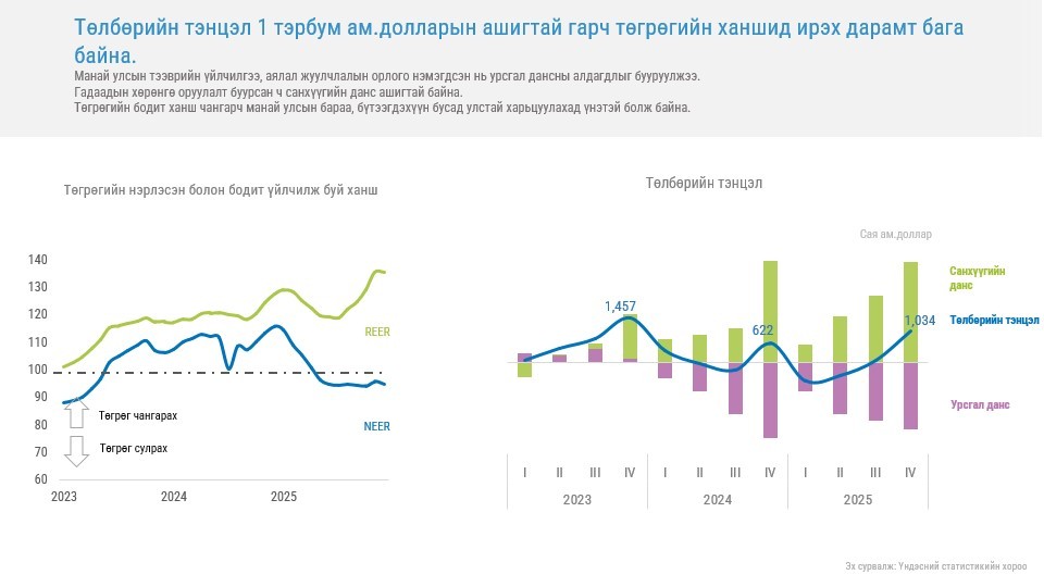Урсгал дансны алдагдал буурч аялал, жуулчлалаас олох орлого нэмэгдсэн, тэр дундаа санхүүгийн данс ашигтай гарсан нь валютын нөөцийг нэмэгдүүлж, төгрөгийн худалдан авах чадвар тогтвортой байхад чухал нөлөө үзүүллээ. Уул уурхайн гол бүтээгдэхүүн болох нүүрсний үнийн бууралтаас шалтгаалан экспортын орлого буурсан хэдий ч зэс, алтны үнийн өсөлт өндөр байсан цэвэр экспорт эерэг гарахад чухал нөлөө үзүүллээ.