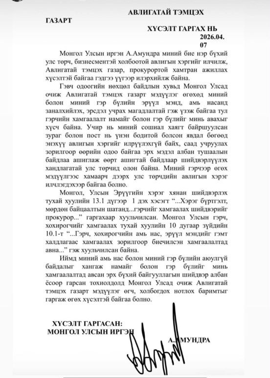 Иймд миний амь нас болон миний гэр бүлийн аюулгүй байдлыг хангаж намайг болон гэр бүлийг минь хамгаалалтад авсан эрх бүхий байгууллагын шийдвэр албан ёсоор гарсан тохиолдолд Монгол Улсад очиж Авлигатай тэмцэх газарт мэдүүлэг өгч, холбогдох нотлох баримтыг гаргаж өгөх хүсэлтэй байгаа болно" хэмээжээ.