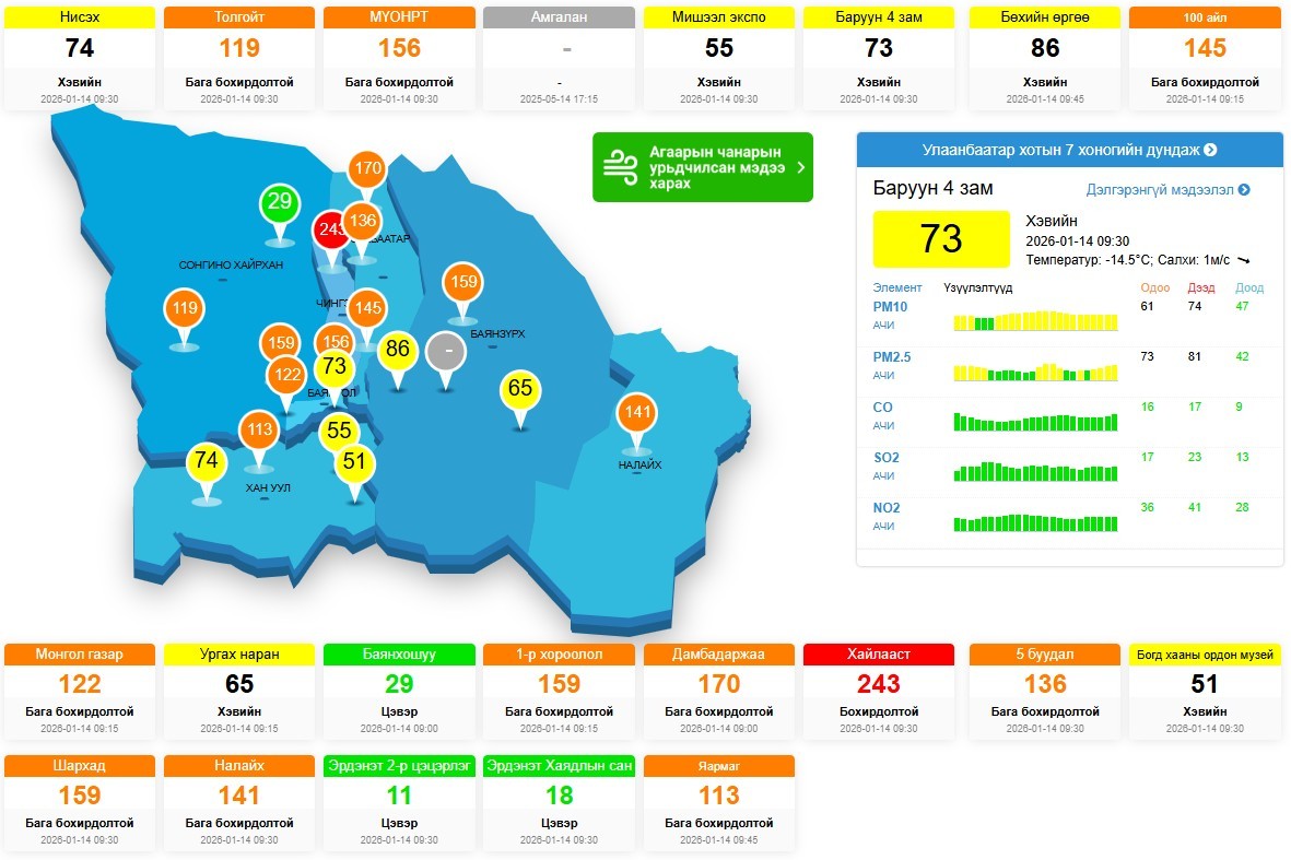 - РМ2.5 тоосонцор нь 14-161 мкг/м3, хамгийн өндөр агууламж илэрсэн цэг Хайлааст орчим 161 мкг/м3 буюу АЧС-аас 4.2 дахин их,