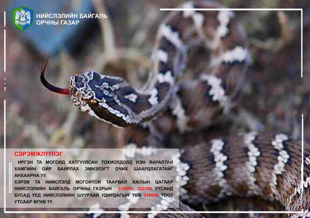 Хэрэв та нийслэлд ийм могойтой таарвал ажлын цагаар Нийслэлийн Байгаль орчны газар -ын 318003, 323780 дугаарт, бусад үед Нийслэлийн шуурхай удирдлагын төвийн 310005 тоот утсаар мэдээлэл өгнө үү.