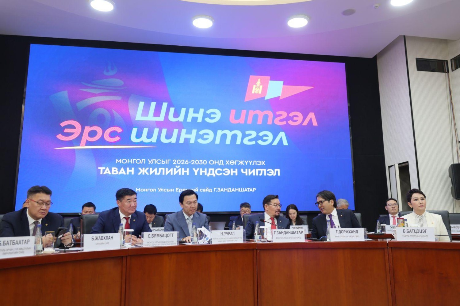 Монгол Улсын Засгийн газраас “Монгол Улсыг 2026-2030 онд хөгжүүлэх таван жилийн үндсэн чиглэл батлах тухай” Улсын Их Хурлын тогтоолын төслийг 2025 оны 10-р сарын 30-нд өргөн мэдүүлсэн. Үүнтэй холбогдуулан Ерөнхий сайд Г.Занданшатар өнөөдөр хэвлэл мэдээллийн салбарынхантай уулзаж, “Шинэ итгэл-Эрс шинэтгэл” буюу “Монгол Улсыг 2026-2030 онд хөгжүүлэх таван жилийн үндсэн чиглэл”-ийг танилцуулан, дэлгэрэнгүй мэдээлэл өглөө. Уулзалтад Засгийн газрын гишүүд, холбогдох албан тушаалтнууд оролцов.