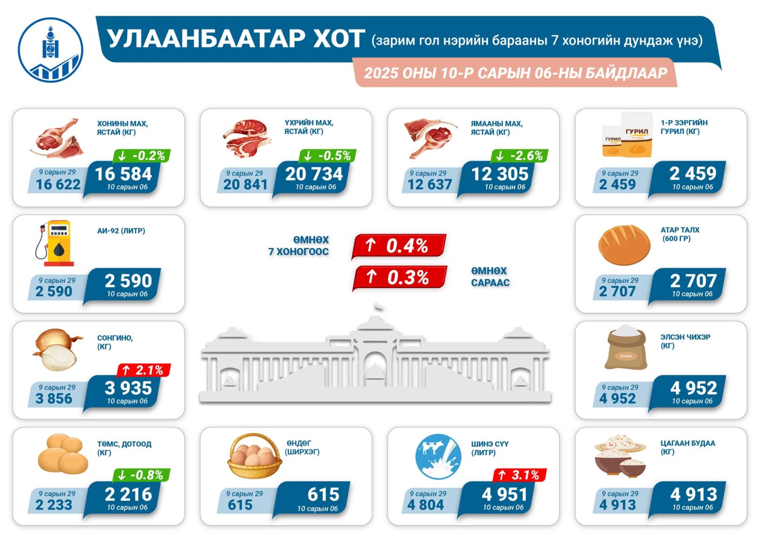 Улаанбаатар хотод хүнсний барааны үнэ өмнөх сараас 0.3 хувиар, өмнөх долоо хоногоос 0.4 хувиар тус тус өссөн байна.