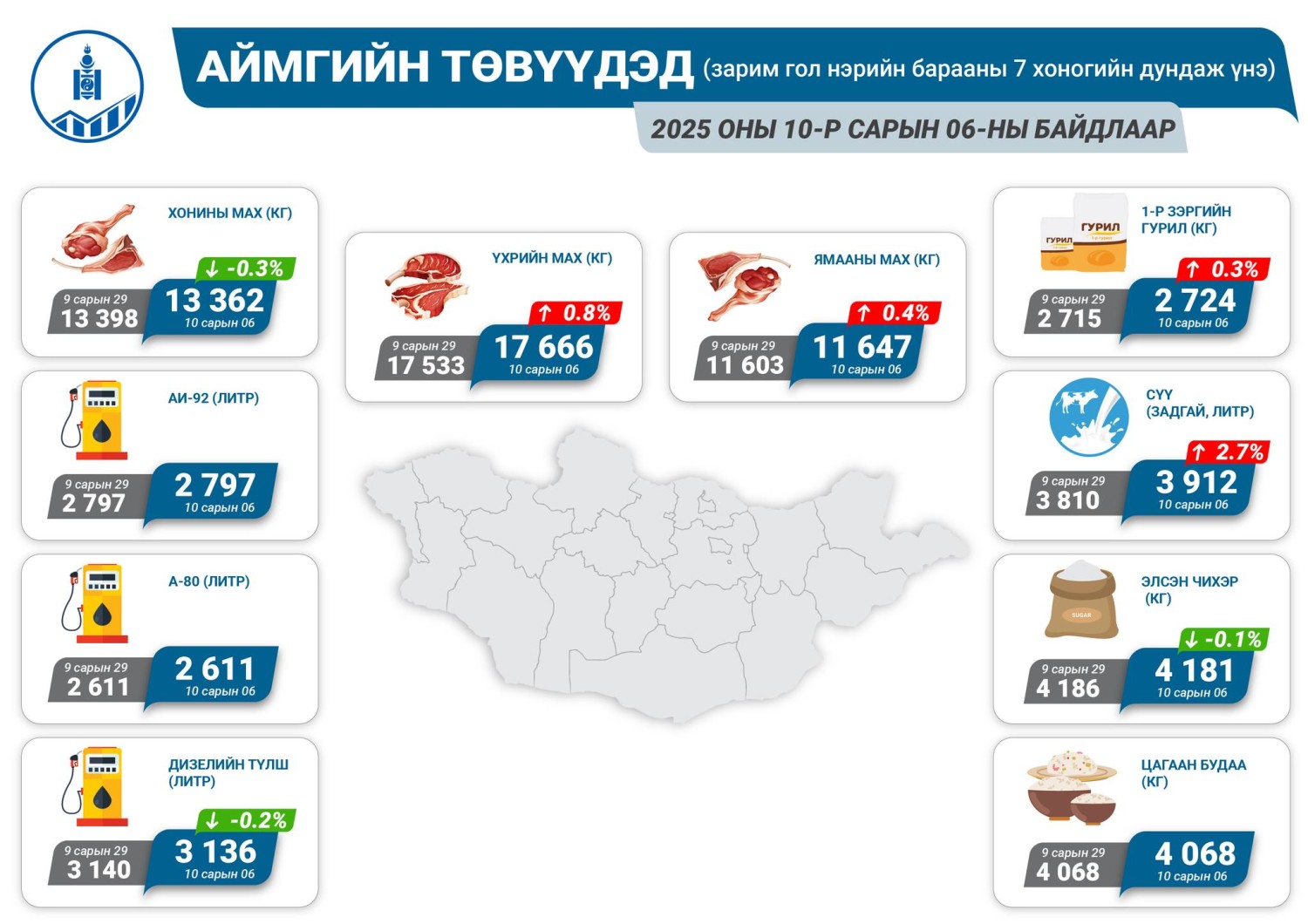 Энэ сарын 6-ны байдлаар нийслэл болон аймгийн төвүүдэд худалдаалж буй гол нэрийн зарим хүнсний барааны дундаж үнийг ҮСХ-оос танилцууллаа.