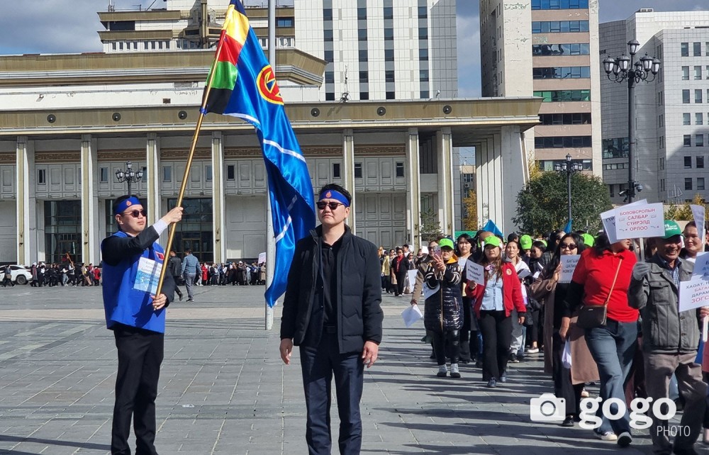 Монголын нийт багш нарын төлөөлөл цалингаа нэмүүлэхийг шаардаж өнөөдөр төв талбайд жагслаа. Тэд албан ёсны шаардлагаа хүргүүлээд төрийн ордныг тойрон алхсан юм.