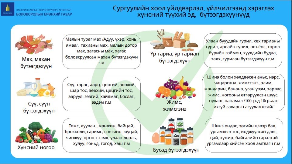 Хүнс, хөдөө аж ахуй, хөнгөн үйлдвэрийн сайд, Эрүүл мэндийн сайд хамтран 2020 оны 06 дугаар сарын 30-ны өдрийн "Ерөнхий боловсролын сургуулийн хоол үйлдвэрлэл, үйлчилгээнд хэрэглэх хүнсний түүхий эд, бүтээгдэхүүний жагсаалт”-ыг баталсан.