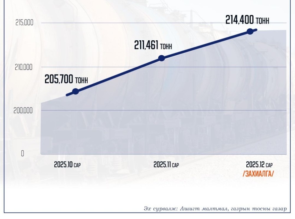 Энэ сард 214.400 тонн шатахуун худалдан авахаар захиалга өглөө хэмээн АМГТГ-аас мэдээлэв. Ингэснээр газрын тосны нийлүүлэлт хэвийн, тогтвортой байна. Энэ сарын 1-5-ны өдрийг хүртэл нийт 35450 тонн шатахуун импортолжээ.