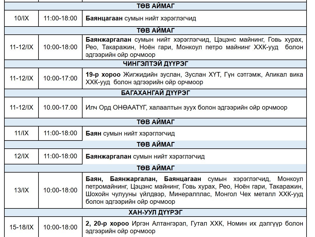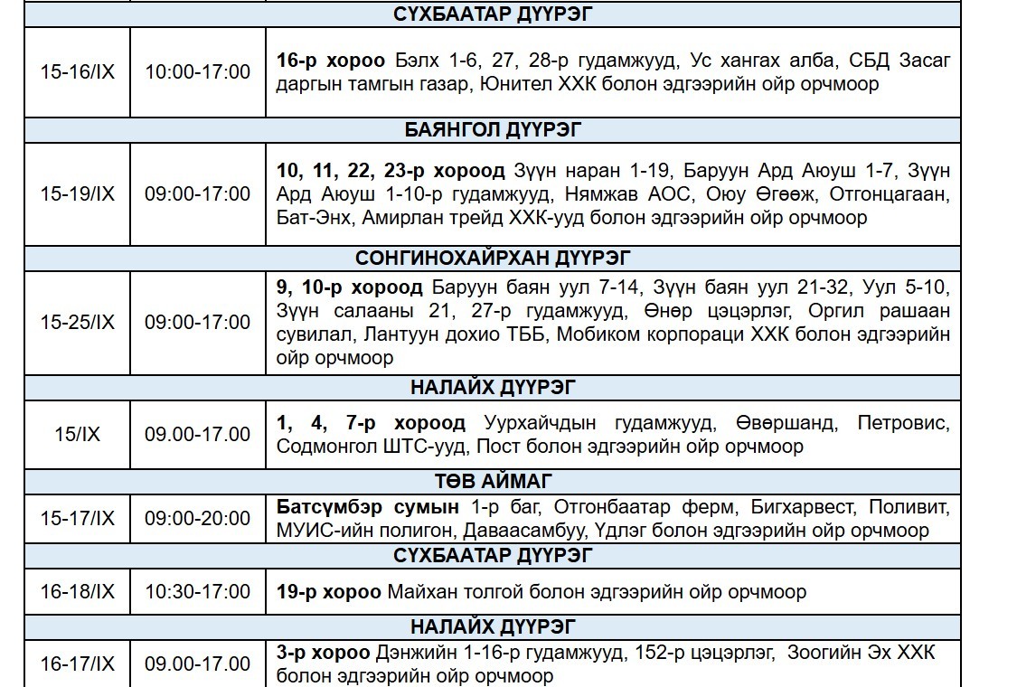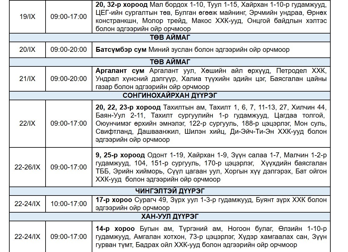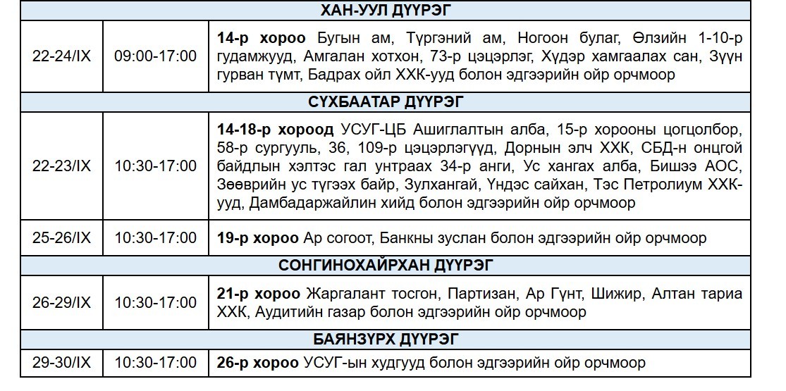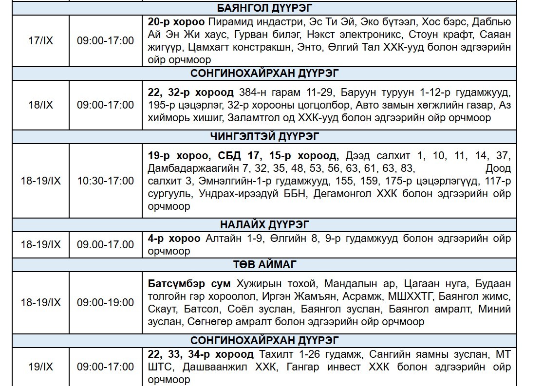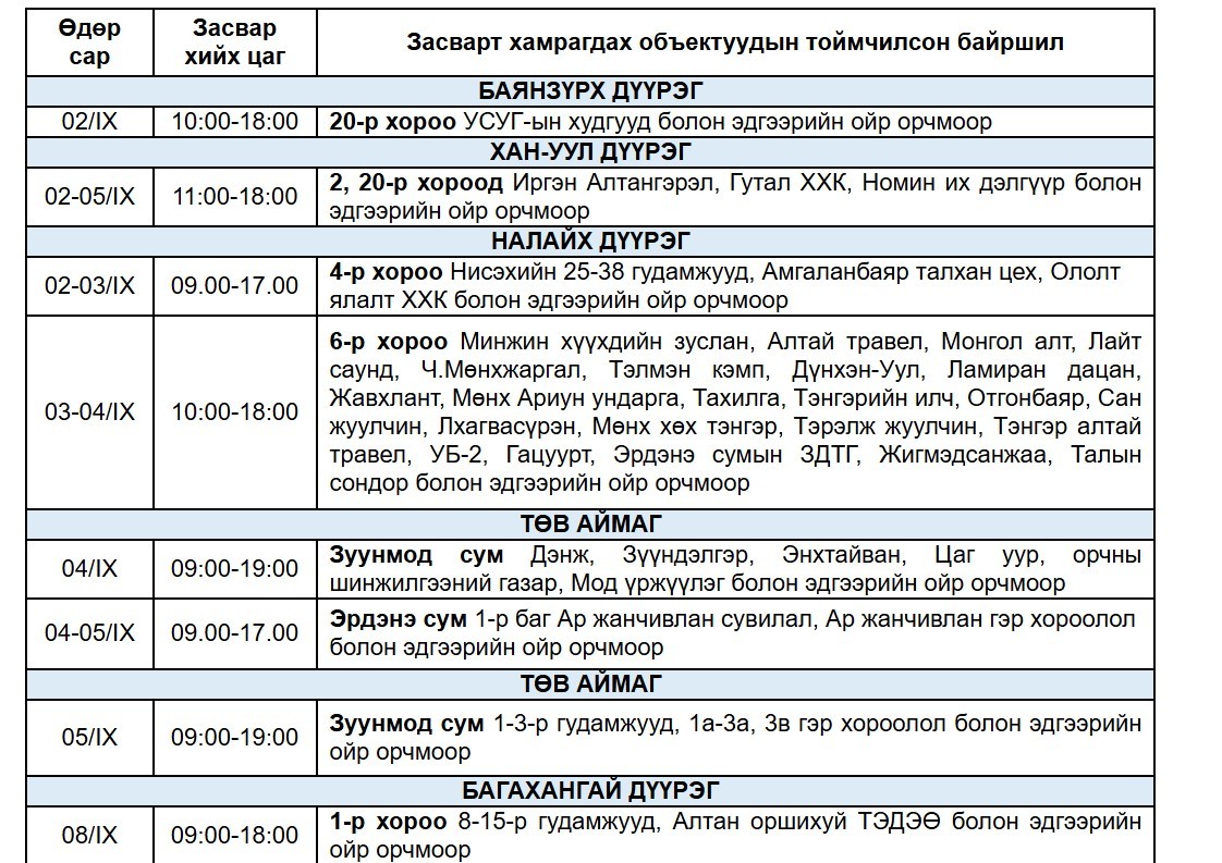 "Улаанбаатар цахилгаан түгээх сүлжээ" ТӨХК-аас цахилгаан шугам тоноглолд засвар үйлчилгээ хийх есдүгээр сарын хуваарийг гаргажээ.