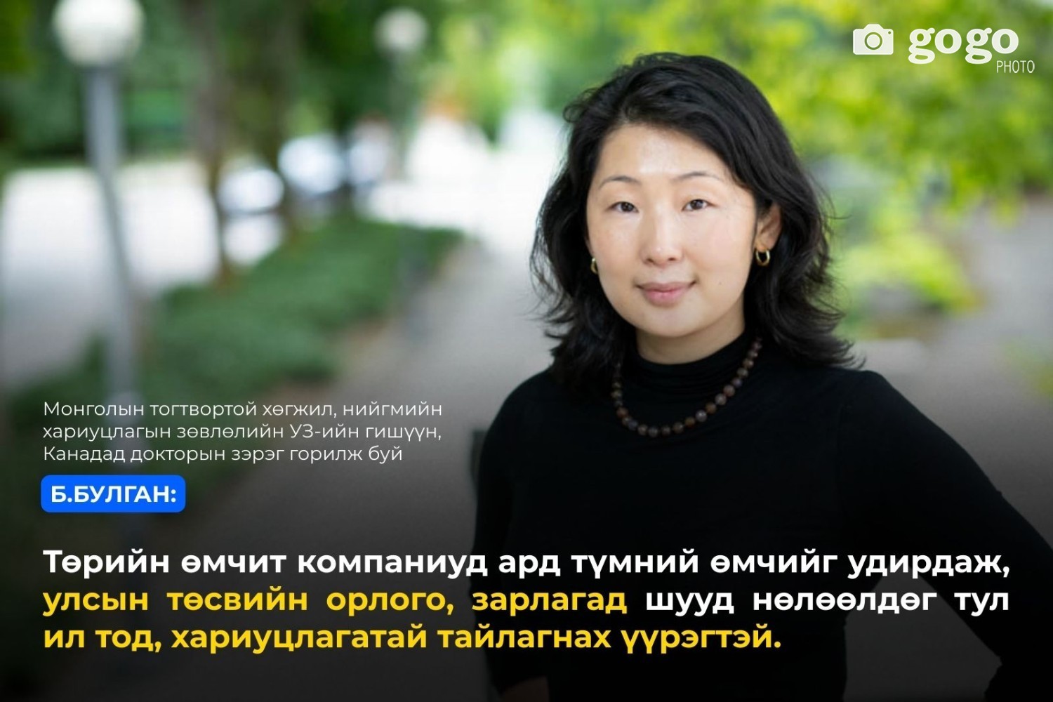 Бусад улсын туршлагын талаар Монголын тогтвортой хөгжил, нийгмийн хариуцлагын зөвлөлийн удирдах зөвлөлийн гишүүн, Канадын Бритиш Колумбын Их сургуулийн Байгалийн баялаг, байгаль орчин, тогтвортой хөгжлийн институтын докторант Б.Булгантай ярилцав. Тэрээр Канадад сурч байгаа юм.