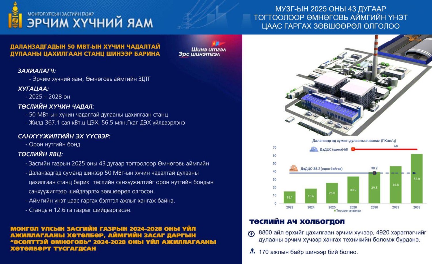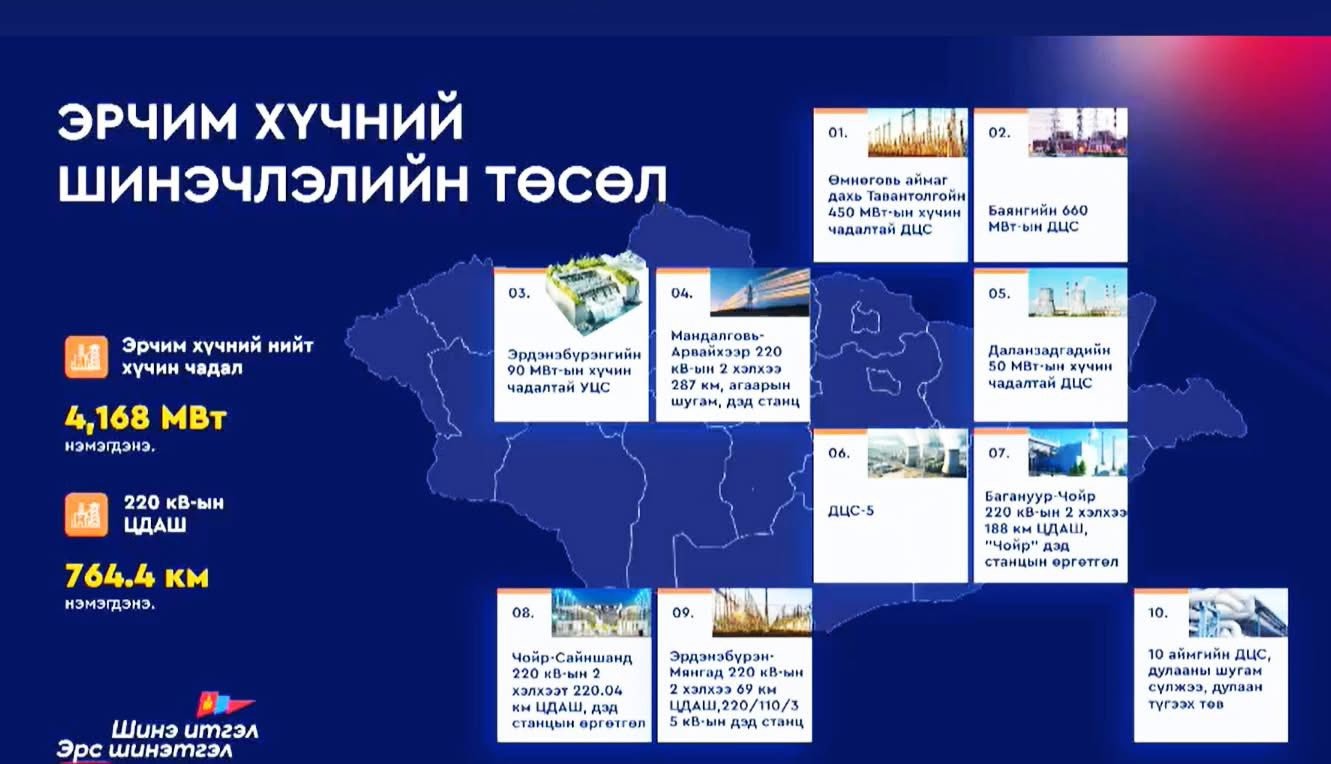 - Тавантолгойн цахилгаан станц, V ДЦС, бусад эх үүсвэрүүдийг өргөтгөснөөр Монгол Улсын эрчим хүчний нийт суурилагдсан хүчин чадал 4168 МВт хүрнэ.