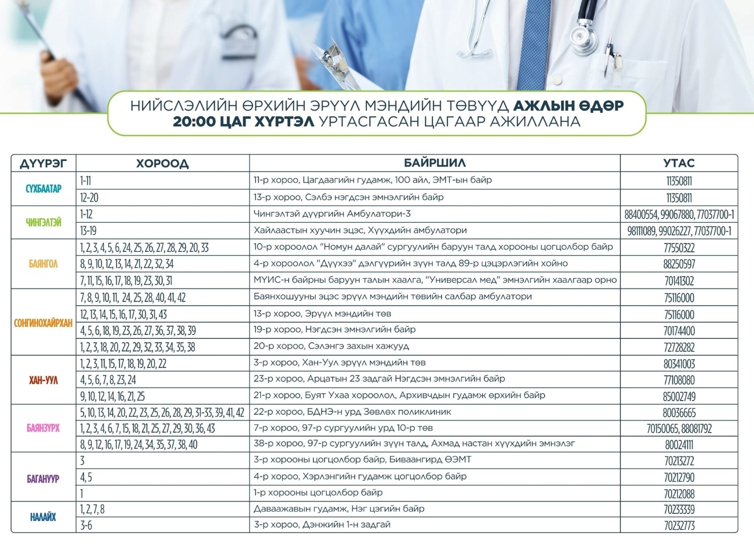 Томуугийн өвчлөл нэмэгдсэнтэй холбоотойгоор нийслэл өрхийн мэндийн төвүүд өнөөдрөөс уртасгасан цагаар ажиллаж байна. Дараах өрхийн эмнэлгүүд уртасгасан цагаар буюу