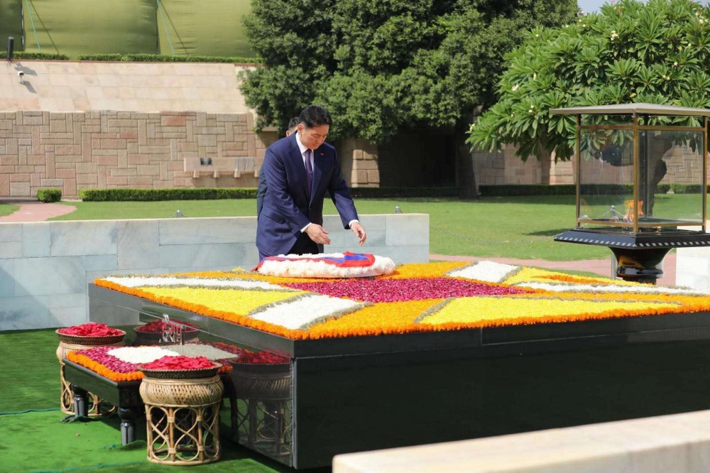 Ерөнхийлөгч У.Хүрэлсүх дэлхийн энх тайван, шударга ёсны бэлгэ тэмдэг болсон аугаа суут хүмүүн Махатма Гандигийн дурсгалын цогцолборт хүндэтгэл үзүүлж, цэцэг өргөлөө.
